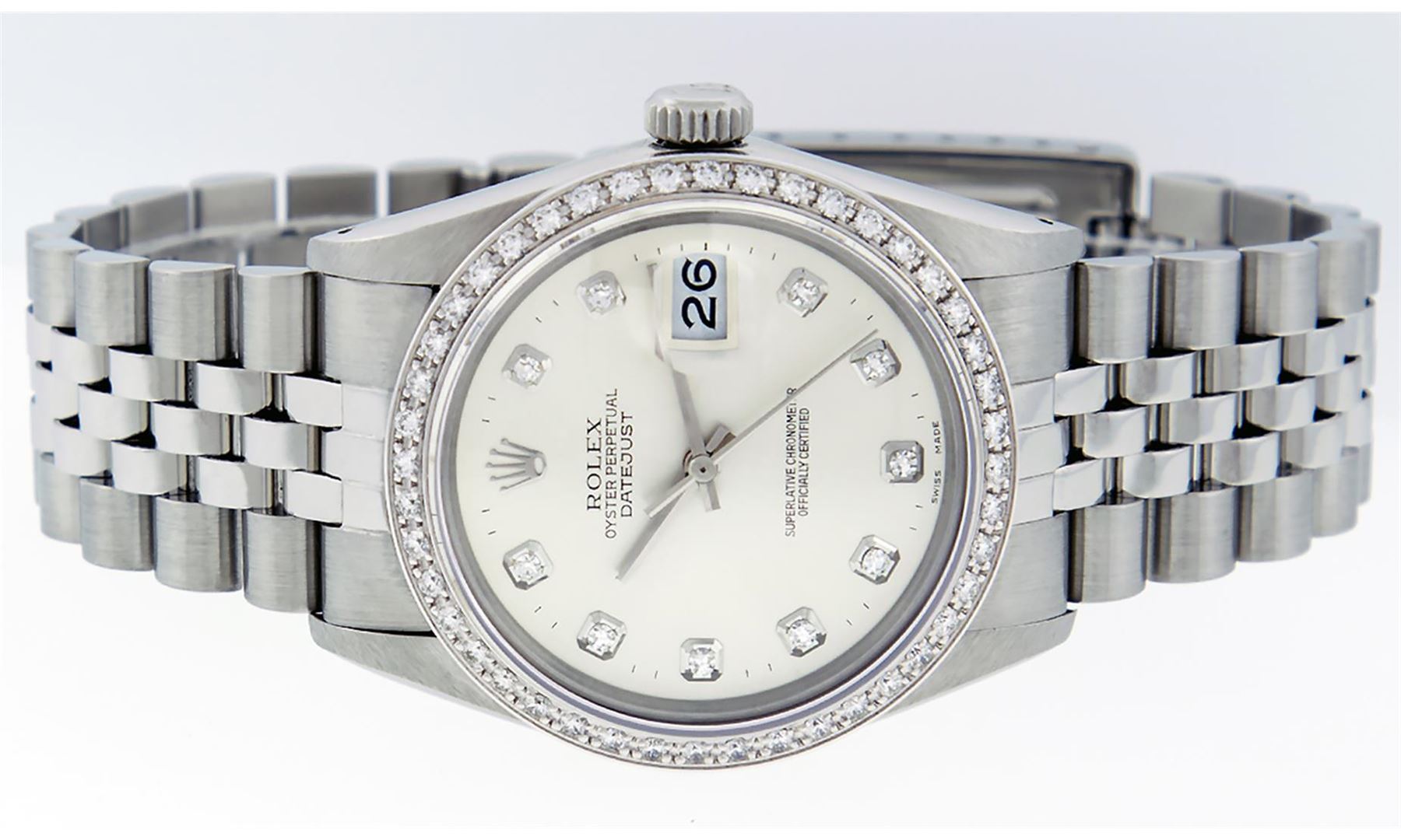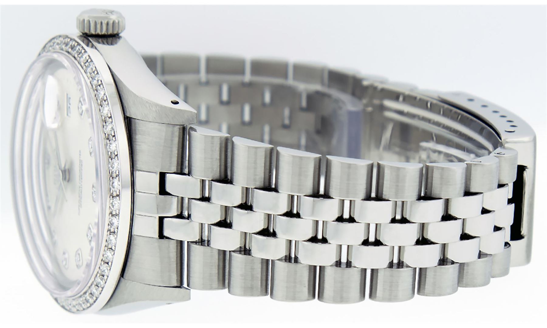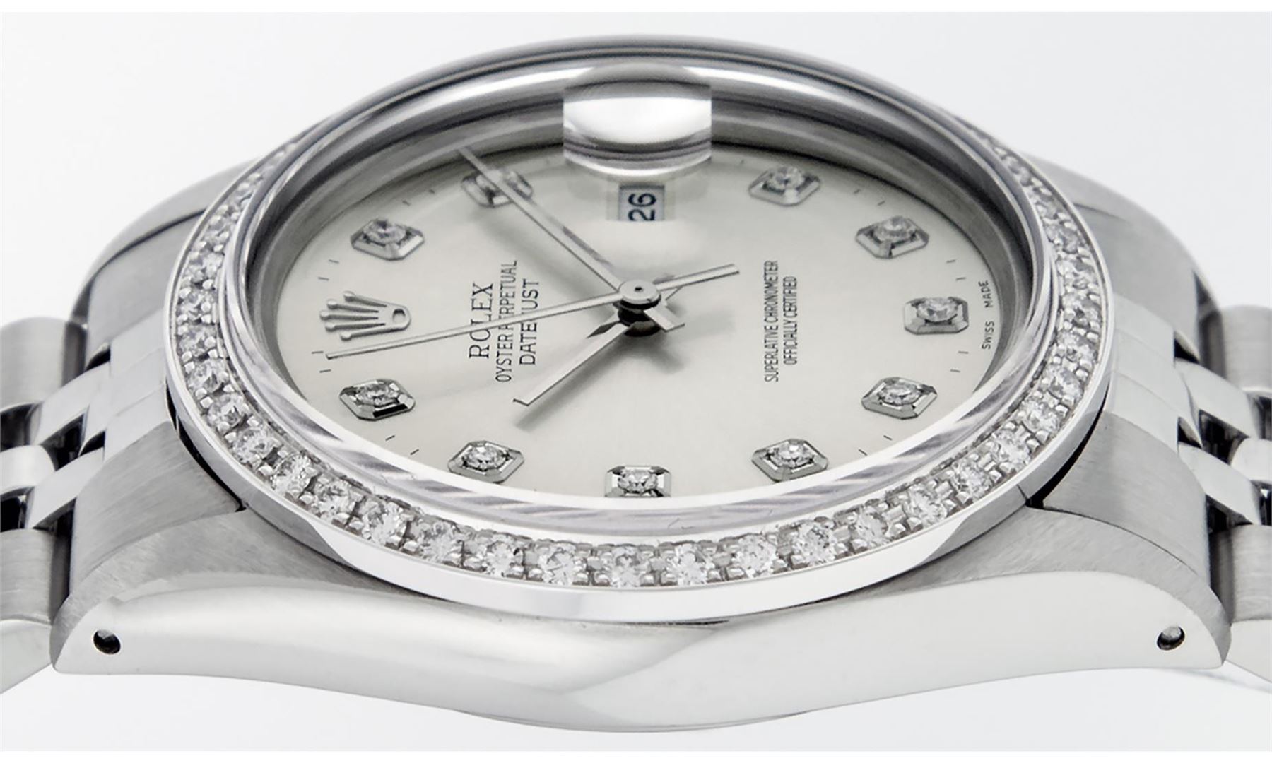 One Mens Stainless Steel Rolex Datejust Polished, Serviced & Electronically Tested, Stainless Steel Case: 36mm, Stainless Steel Crown, Custom Bezel: New 18K White Gold Beadset Diamond Bezel, Diamond Count: 44 Diamonds In Bezel, Total Weight 1.00 Carat, Clarity: SI-VS, Color: G to H. Custom Crystal: New Scratch Resistant Synthetic Sapphire Cyclops Lens. Custom Hands: New Luminescent Hands. Movement: Automatic Winding Movement Caliber 3035. Custom Dial: Silver Diamond Dial With Dash Track, Diamond Count: 10 Diamonds in Dial, G To H In Color, Clarity: SI-VS. Date Window: 3 O'Clock Position Date Display, Quickset, Model: Quickset Datejust. Condition: G-6 Extra Fine. Bracelet: Stainless Steel Jubilee Band. Bright Polish & Satin Finish. 7.0 Inch Length, Adjustable. Standard Clasp, With Rolex Logo. This Watch Has Been Serviced Time Tested And Is In Excellent Condition It Is Free Of All Scratches And Dents.