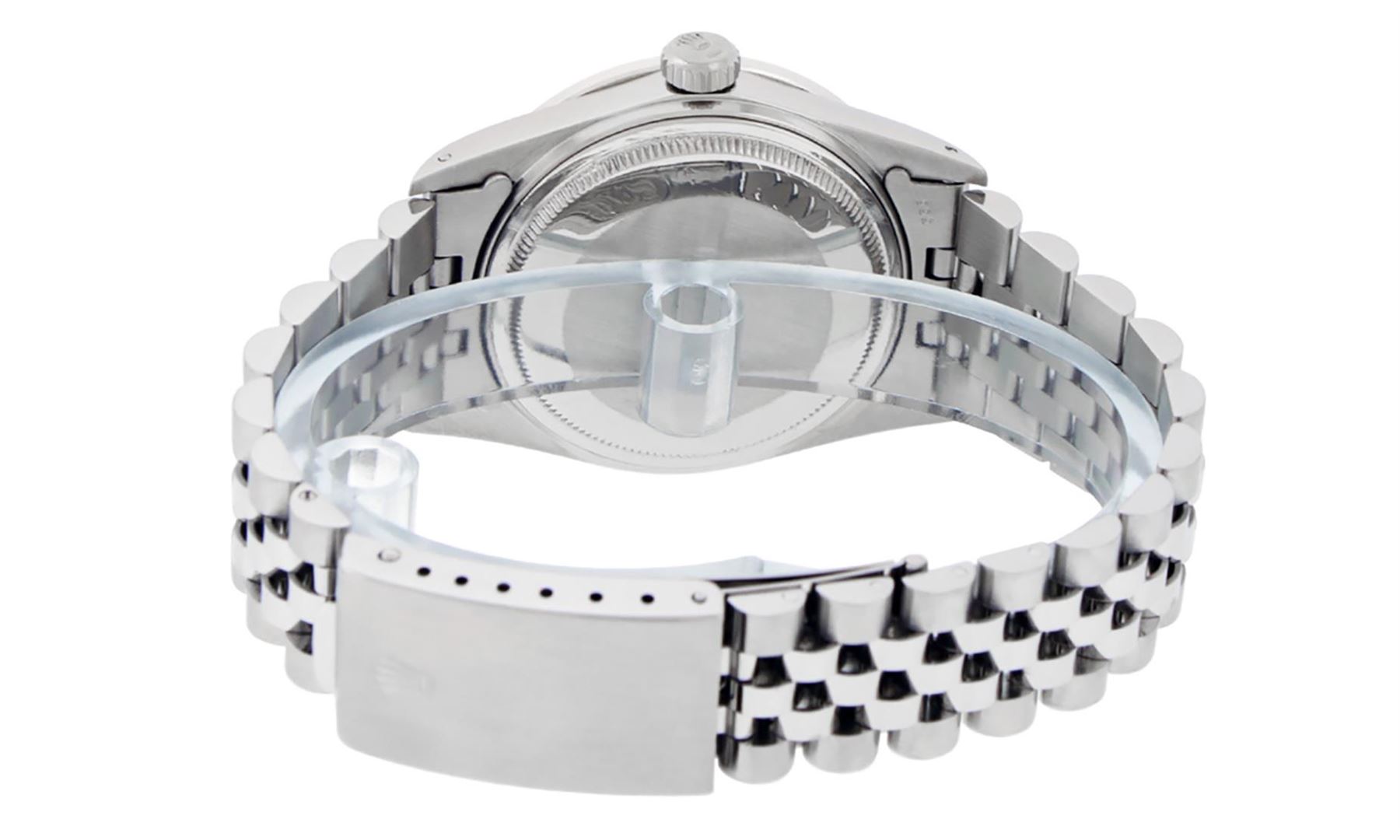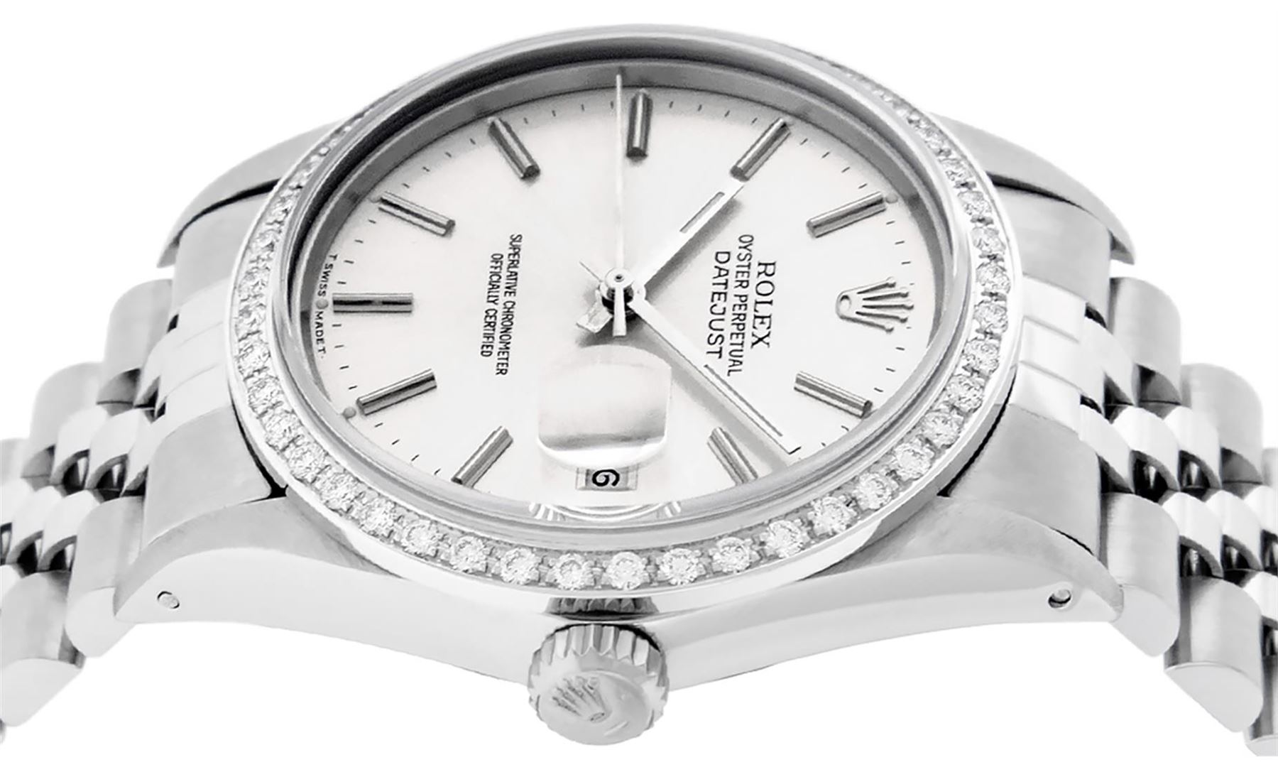 One Mens Stainless Steel Rolex Datejust Polished Bright with Satin Finish, This Watch Has Been Serviced & Electronically Tested, Stainless Steel Case: 36mm, Stainless Steel Crown, Custom Bezel: New 18K White Gold Beadset Diamond Bezel, Diamond Count:�44 Diamonds, Total Weight 1.00 Carat, Clarity: SI-VS, Color: G to H. Custom Crystal: New Scratch Resistant Synthetic Sapphire Cyclops Lens. Custom Hands: New Luminescent Hands. Movement: Automatic Winding Movement Caliber 3035. Dial: Silver Index With Dash Track & Lumi Dot. Date Window: 3 O'Clock Position Date Display, Quickset, Model: Datejust, Condition: G-6 Extra Fine. Bracelet: Stainless Steel Jubilee. Bracelet: 7.0 Inch Length, Adjustable. Standard Clasp, With Rolex Logo. This Watch Has Been Serviced Time Tested And Is In Excellent Condition It Is Free Of All Scratches And Dents.