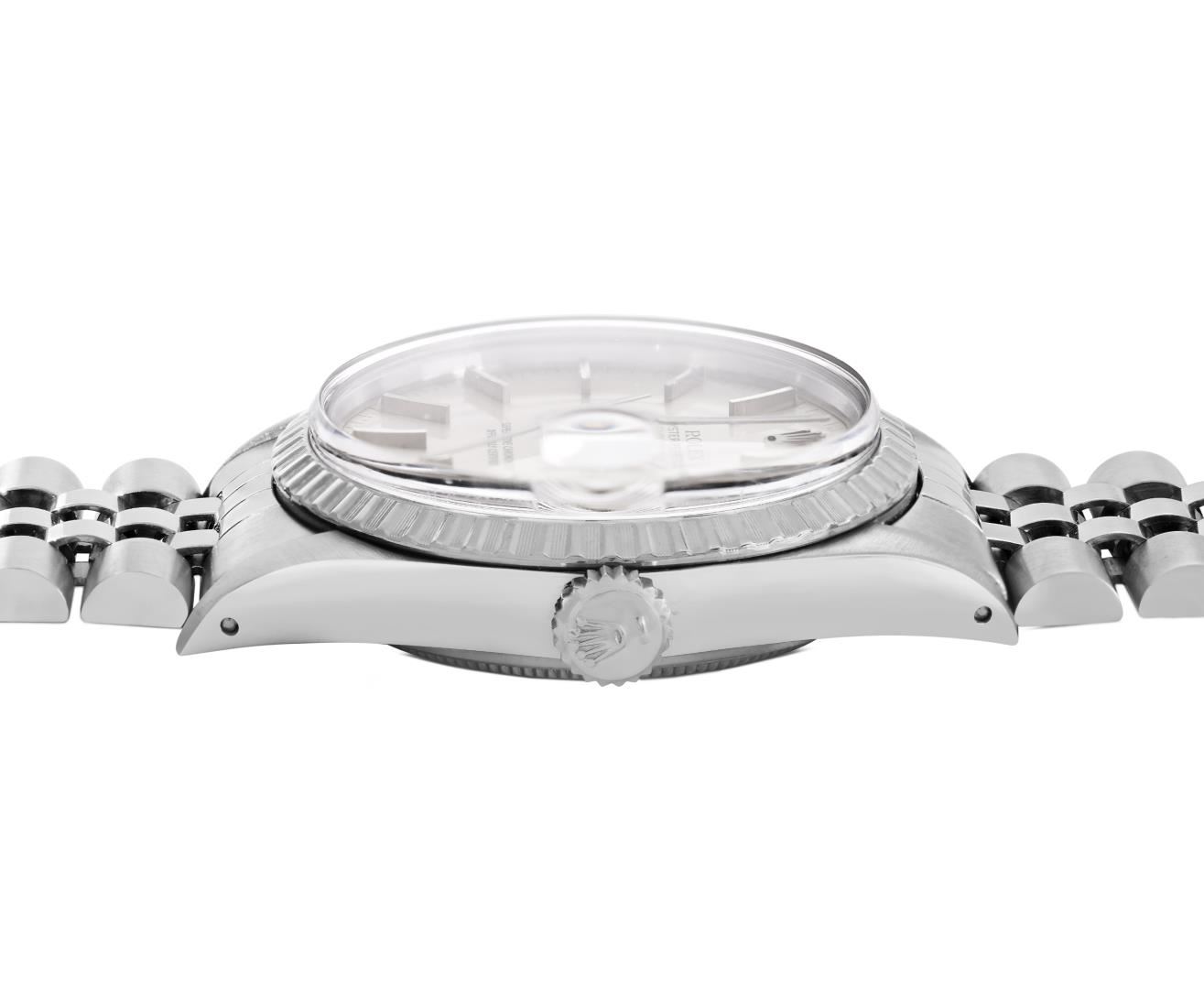 One Mens Pre Owned Rolex Stainless Steel Datejust Polished Bright with Satin Finish, Serviced & Electronically Tested, Rolex Stainless Steel Case: 36mm, Rolex Stainless Steel Crown, Rolex Bezel: Rolex Stainless Steel Engine Turn Bezel. Custom Crystal: New Acrylic Crystal With Magnifying Date Window. Rolex Movement: Automatic Winding Movement Caliber 3035. Rolex Dial: Silver Index With Open Track and Lumi Dots. Custom Hands: New Lumi Hands. Date Window: 3 O'Clock Position Date Display, Quickset, Model: Quickset Datejust. Condition: G-6 Extra Fine. Rolex Bracelet: Stainless Steel Jubilee Band. Bright Polish & Satin Finish. 7.0 Inch Length, Adjustable. Fold Clasp, With Rolex Logo. This Watch Has Been Serviced Time Tested And Is In Excellent Condition It Is Free Of All Scratches And Dents.