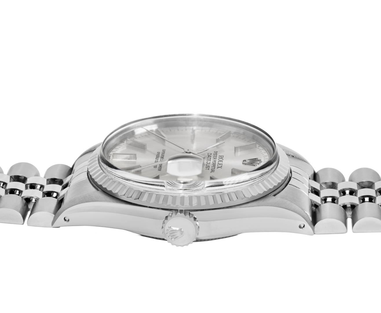 One Mens Pre Owned Rolex Stainless Steel Datejust Polished Bright with Satin Finish, Serviced & Electronically Tested, Rolex Stainless Steel Case: 36mm, Rolex Stainless Steel Crown, Rolex Bezel: White Gold Fluted Bezel. Custom Crystal: New Acrylic Crystal With Magnifying Date Window. Rolex Movement: Automatic Winding Movement Caliber 3035. Rolex Dial: Silver Index With Open Track and Lumi Dots. Hands: White Lumi Hands. Date Window: 3 O'clock Position Date Display, Quickset, Model: Quickset Datejust. Condition: G-6 Extra Fine. Rolex Bracelet: Stainless Steel Jubilee Band. Bright Polish & Satin Finish. 7.0 Inch Length, Adjustable. Standard Clasp, With Rolex Logo. This Watch Has Been Serviced Time Tested And Is In Excellent Condition It Is Free Of All Scratches And Dents. This Watch Comes With A Rolex Box.