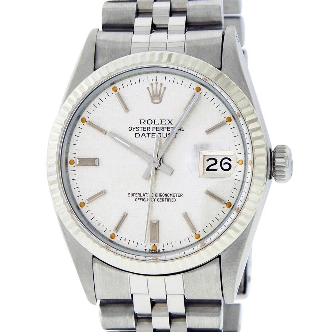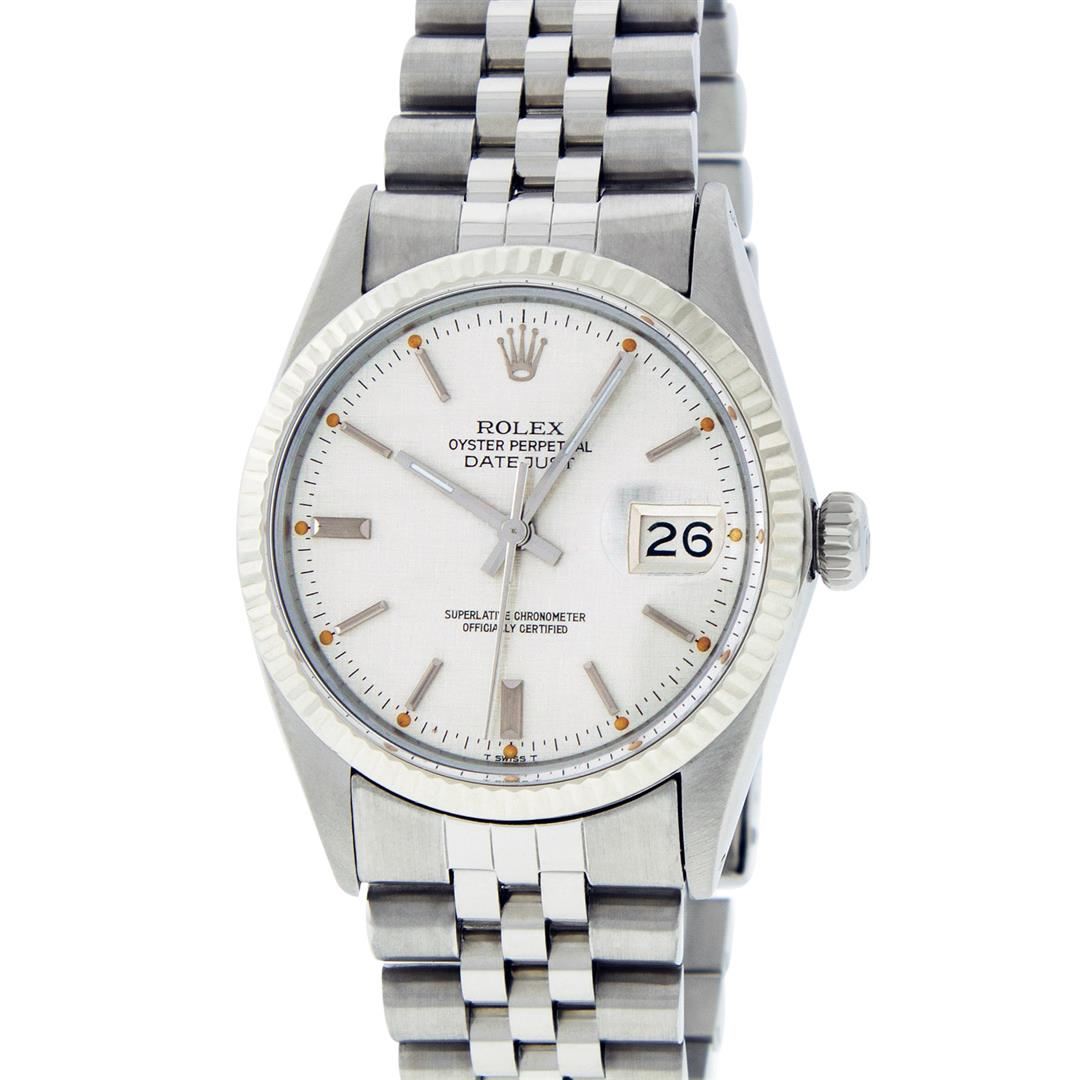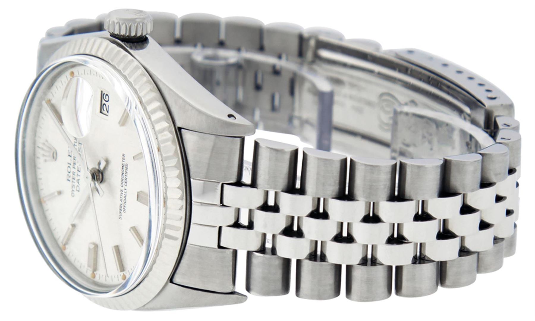 One Mens Rolex Datejust Polished, Serviced & Electronically Tested, Stainless Steel Case:36mm, Stainless Steel Crown, Bezel: 14K White Gold Fluted Bezel. Custom Crystal: Acrylic Cyclops Lens. Custom Hands: New Luminescent Hands. Movement: Automatic Winding Movement Caliber 3035. Dial: Silver Index With Lumi Dots. Date Window: 3 O'Clock Position Date Display, Quickset, Model: Datejust. Condition: G-6 Extra Fine. Bracelet: Rolex Stainless Steel Jubilee. Bright Polish & Satin Finish. 7.0 Inch Length, Adjustable. Standard Clasp, With Rolex Logo. This watch has been serviced and polished and its free of all dents and scratches and has been time tested.