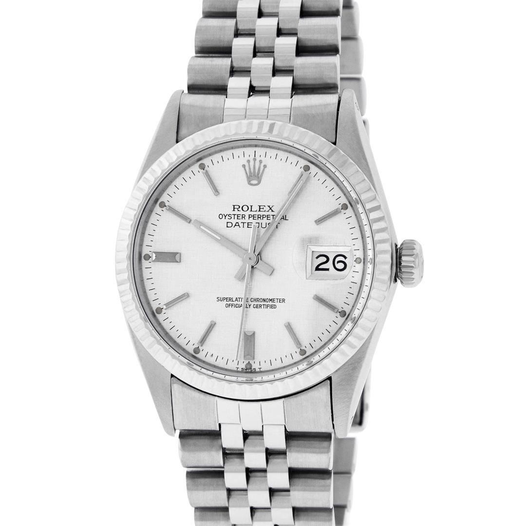 One Mens Pre Owned Stainless Steel Rolex Datejust Polished, Serviced & Electronically Tested, Rolex Stainless Steel Case: 36mm, Rolex Stainless Steel Crown, Bezel: 14K White Gold Fluted Bezel. Custom Crystal: Acrylic Crystal, Custom Hands: New Luminescent Hands. Movement: Automatic Winding Movement. Rolex Dial: Silver Index With Dash Track & Lumi Dot. Date Window: 3 O'Clock Position Date Display, Quickset, Model: Datejust, Condition: G-6 Extra Fine. Rolex Bracelet: Stainless Steel Jubilee Band. Bright Polish & Satin Finish. 7.0 Inch Length, Adjustable. Standard Clasp, With Rolex Logo. This Watch Has Been Serviced Time Tested And Is In Excellent Condition It Is Free Of All Scratches And Dents.