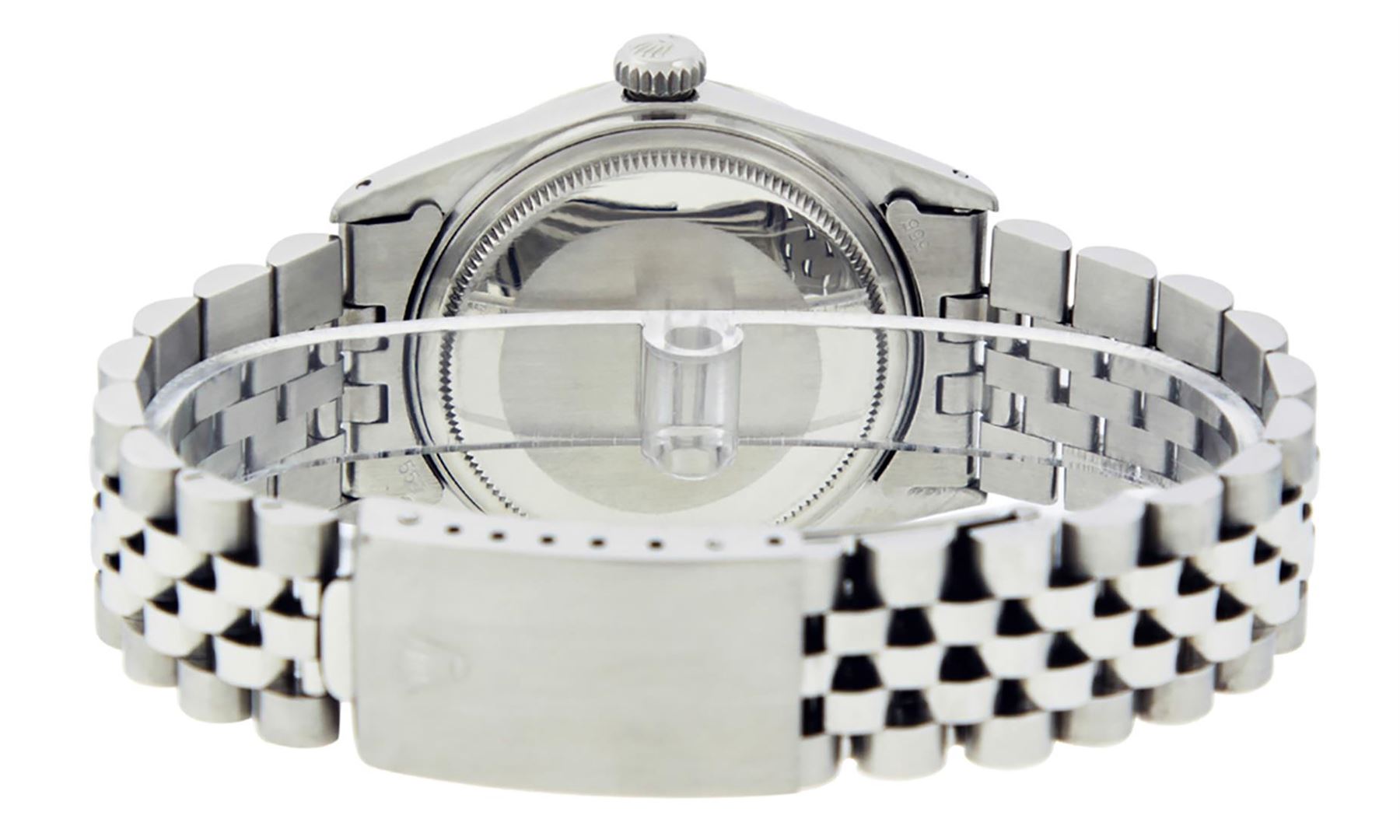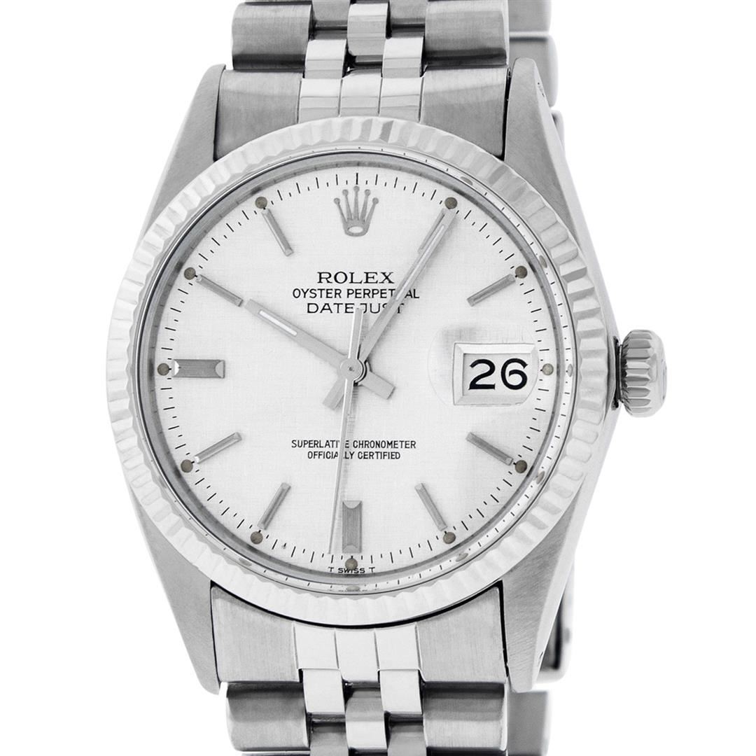 One Mens Pre Owned Stainless Steel Rolex Datejust Polished, Serviced & Electronically Tested, Rolex Stainless Steel Case: 36mm, Rolex Stainless Steel Crown, Bezel: 14K White Gold Fluted Bezel. Custom Crystal: Acrylic Crystal, Custom Hands: New Luminescent Hands. Movement: Automatic Winding Movement. Rolex Dial: Silver Index With Dash Track & Lumi Dot. Date Window: 3 O'Clock Position Date Display, Quickset, Model: Datejust, Condition: G-6 Extra Fine. Rolex Bracelet: Stainless Steel Jubilee Band. Bright Polish & Satin Finish. 7.0 Inch Length, Adjustable. Standard Clasp, With Rolex Logo. This Watch Has Been Serviced Time Tested And Is In Excellent Condition It Is Free Of All Scratches And Dents.