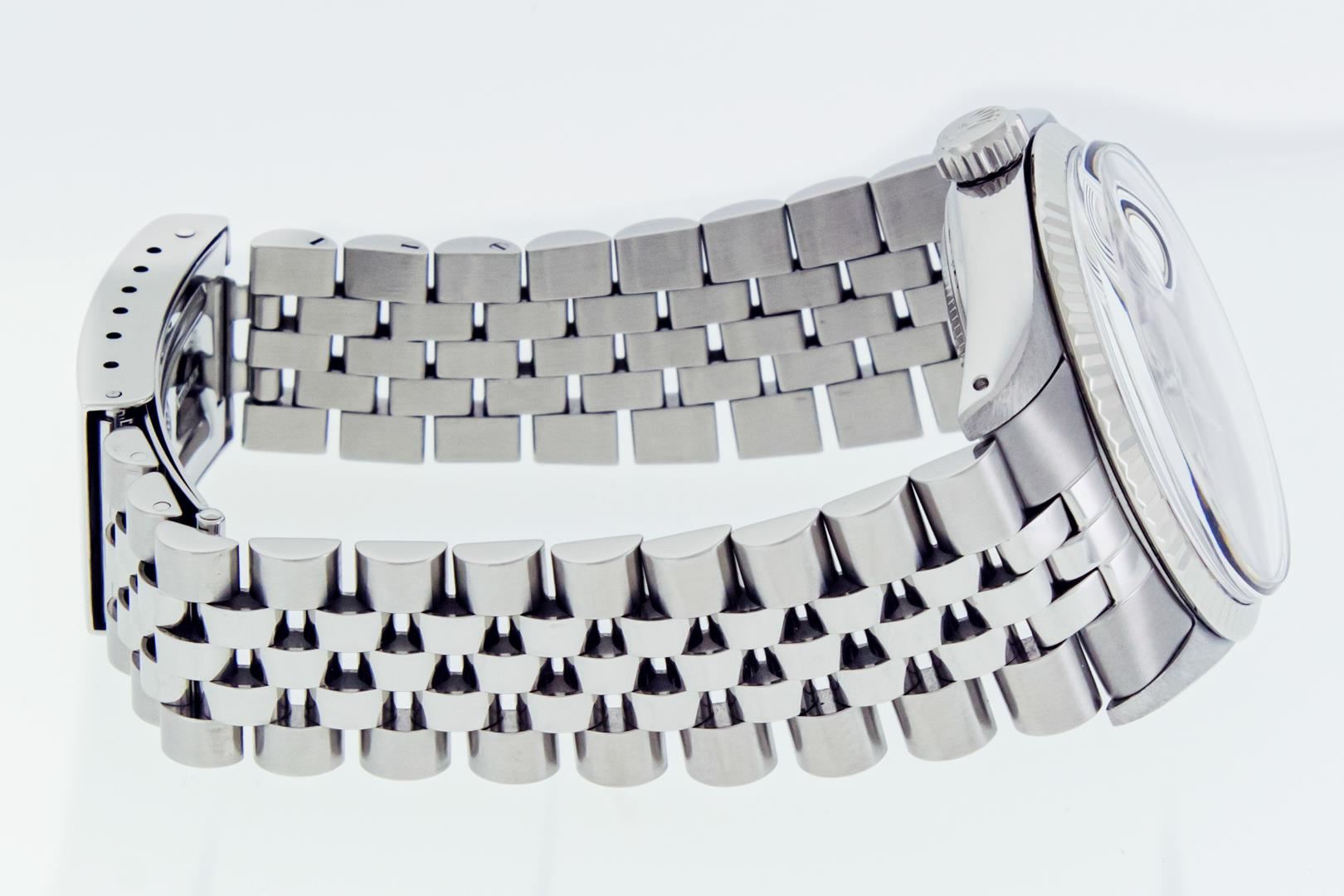 One Mens Pre Owned Rolex Datejust Polished Bright with Satin Finish, This Watch Has Been Serviced & Electronically Tested, Rolex Stainless Steel Case: 36mm, Rolex Stainless Steel Crown, Bezel: 14K White Gold Fluted Bezel. Custom Crystal: New Plastic With Date Window. Custom Hands: New Luminescent Hands. Rolex Movement: Automatic Winding Movement. Rolex Dial: Silver Index Dial With Dash Track. Date Window: 3 O'Clock Position Date Display, Quickset, Model: Datejust, Condition: G-6 Extra Fine. Rolex Bracelet: Stainless Steel Jubilee Band. Bracelet: 7.0 Inch Length, Adjustable. Standard Clasp, With Rolex Logo. This Watch Has Been Serviced Time Tested And Is In Excellent Condition It Is Free Of All Scratches And Dents.