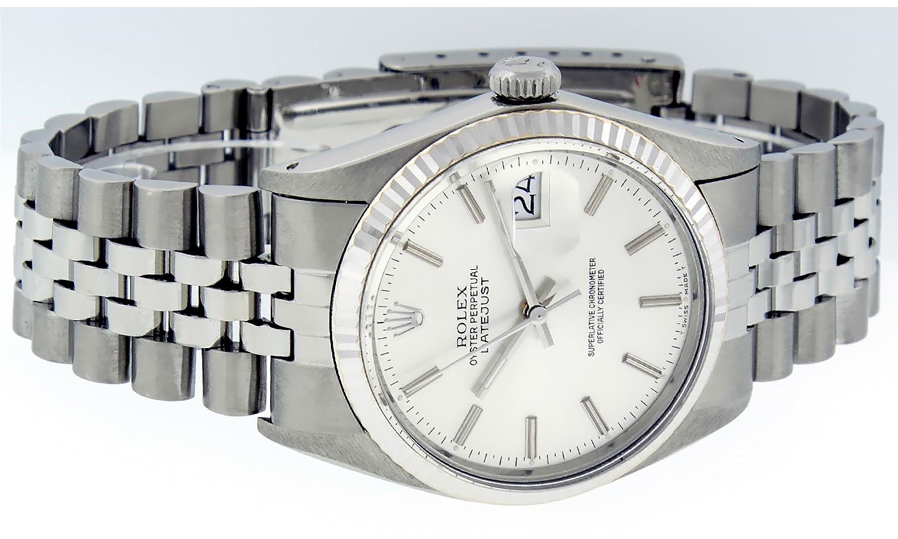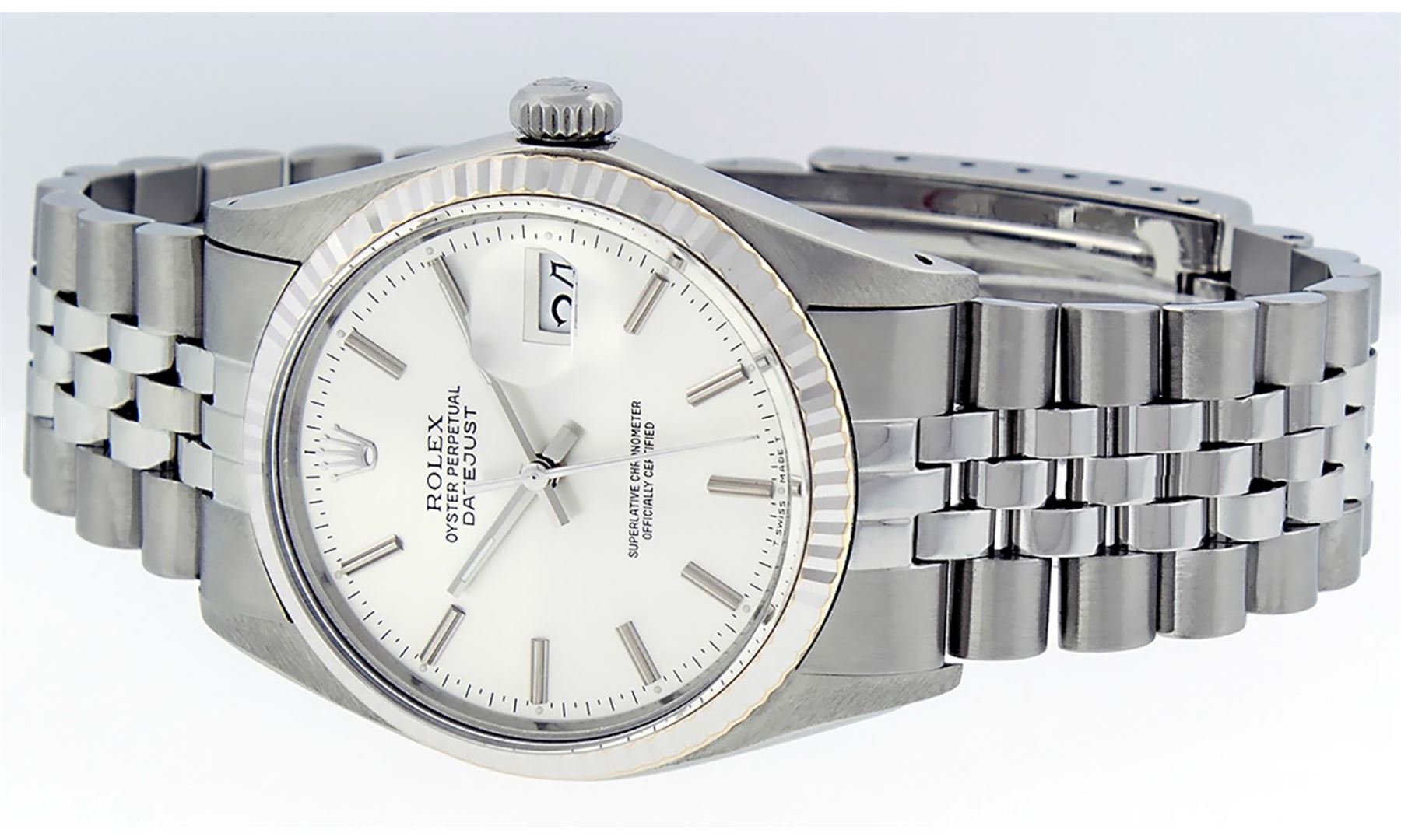 One Mens Pre Owned Stainless Steel Rolex Datejust Polished, Serviced & Electronically Tested, Rolex Stainless Steel Case: 36mm, Rolex Stainless Steel Crown, Rolex Bezel: 14K White Gold Fluted Bezel. Custom Crystal: New Acrylic With Date Window. Custom Hands: New Luminescent Hands. Rolex Movement: Automatic Winding Movement 3035. Rolex Dial: Silver Index With Dash Track And Lumi Dots. Date Window: 3 O'Clock Position Date Display, Quickset, Model: Datejust, Condition: G-6 Extra Fine. Rolex Bracelet: Stainless Steel Jubilee Band. Bright Polish & Satin Finish. 7.0 Inch Length, Adjustable. Standard Clasp, With Rolex Logo. This Watch Has Been Serviced Time Tested And Is In Excellent Condition It Is Free Of All Scratches And Dents.