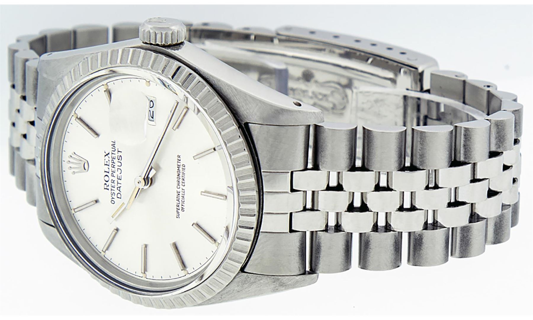 One Mens Pre Owned Stainless Steel Rolex Datejust Polished, Serviced & Electronically Tested, Rolex Stainless Steel Case: 36mm, Stainless Steel Crown, Rolex Bezel: Stainless Steel Engine Turn Bezel. Custom Crystal: Acrylic With Date Window. Hands: Luminescent Hands. Rolex Movement: Automatic Winding Movement 3035. Rolex Dial: Silver Index With Dash Track And Lumi Dots. Date Window: 3 O'Clock Position Date Display, Quickset, Model: Datejust, Condition: G-6 Extra Fine. Rolex Bracelet: Stainless Steel Jubilee Band. Bright Polish & Satin Finish. 7.0 Inch Length, Adjustable. Standard Clasp, With Rolex Logo. This Watch Has Been Serviced Time Tested And Is In Excellent Condition It Is Free Of All Scratches And Dents.