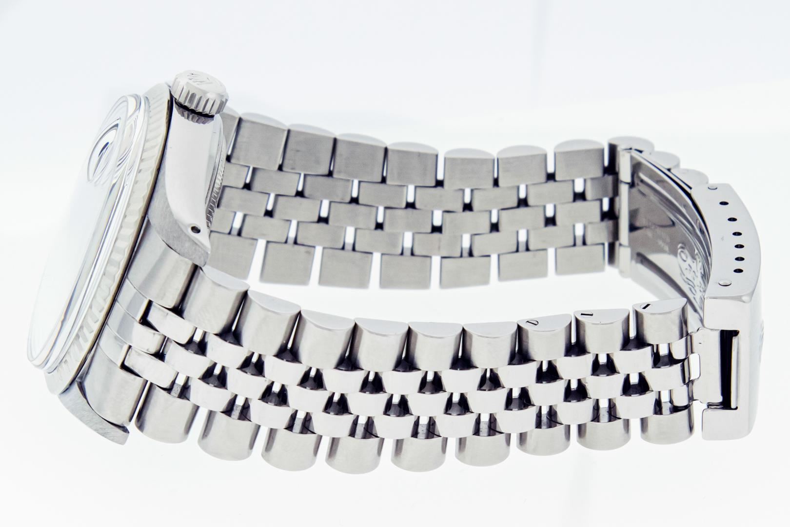 One Mens Pre Owned Rolex Datejust Polished Bright with Satin Finish, This Watch Has Been Serviced & Electronically Tested, Rolex Stainless Steel Case: 36mm, Rolex Stainless Steel Crown, Bezel: 14K White Gold Fluted Bezel. Custom Crystal: New Plastic With Date Window. Custom Hands: New Luminescent Hands. Rolex Movement: Automatic Winding Movement. Rolex Dial: Silver Index Dial With Dash Track. Date Window: 3 O'Clock Position Date Display, Quickset, Model: Datejust, Condition: G-6 Extra Fine. Rolex Bracelet: Stainless Steel Jubilee Band. Bracelet: 7.0 Inch Length, Adjustable. Standard Clasp, With Rolex Logo. This Watch Has Been Serviced Time Tested And Is In Excellent Condition It Is Free Of All Scratches And Dents.