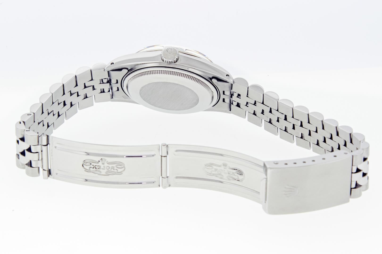 One Mens Pre Owned Rolex Datejust Polished Bright with Satin Finish, This Watch Has Been Serviced & Electronically Tested, Rolex Stainless Steel Case: 36mm, Rolex Stainless Steel Crown, Bezel: 14K White Gold Fluted Bezel. Custom Crystal: New Plastic With Date Window. Custom Hands: New Luminescent Hands. Rolex Movement: Automatic Winding Movement. Rolex Dial: Silver Index Dial With Dash Track. Date Window: 3 O'Clock Position Date Display, Quickset, Model: Datejust, Condition: G-6 Extra Fine. Rolex Bracelet: Stainless Steel Jubilee Band. Bracelet: 7.0 Inch Length, Adjustable. Standard Clasp, With Rolex Logo. This Watch Has Been Serviced Time Tested And Is In Excellent Condition It Is Free Of All Scratches And Dents.