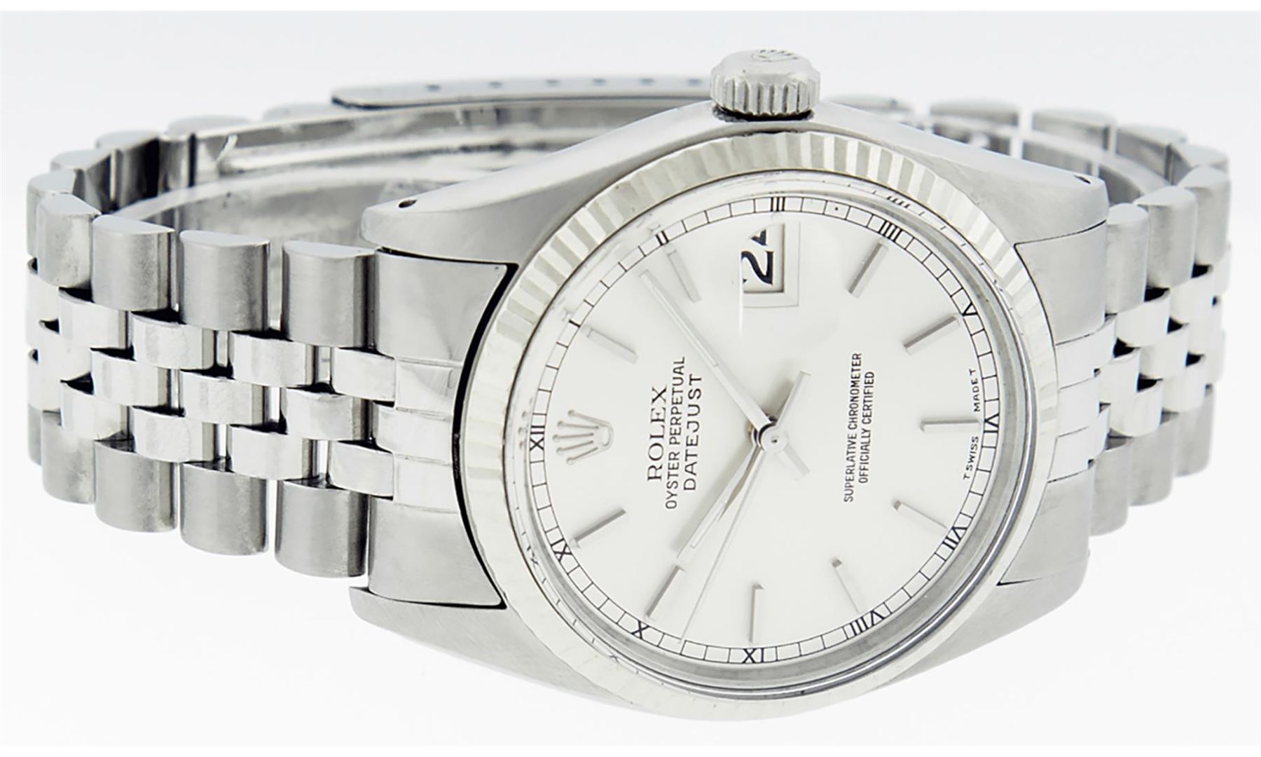 One Mens Pre Owned Rolex Stainless Steel Rolex Datejust Polished, Serviced & Electronically Tested, Rolex Stainless Steel Case: 36mm, Rolex Stainless Steel Crown, Rolex Bezel: 14K White Gold Fluted Bezel. Custom Crystal: New Acrylic With Magnified Date Window. Hands: Luminescent Hands. Rolex Movement: Automatic Winding Movement 3035. Rolex Dial: Silver Index With Roman Square Track. Date Window: 3 O'Clock Position Date Display, Quickset, Model: Datejust, Condition: G-6 Extra Fine. Rolex Bracelet: Stainless Steel Jubilee Band. Bright Polish & Satin Finish. 7.0 Inch Length, Adjustable. Standard Clasp, With Rolex Logo. This Watch Has Been Serviced Time Tested And Is In Excellent Condition It Is Free Of All Scratches And Dents.