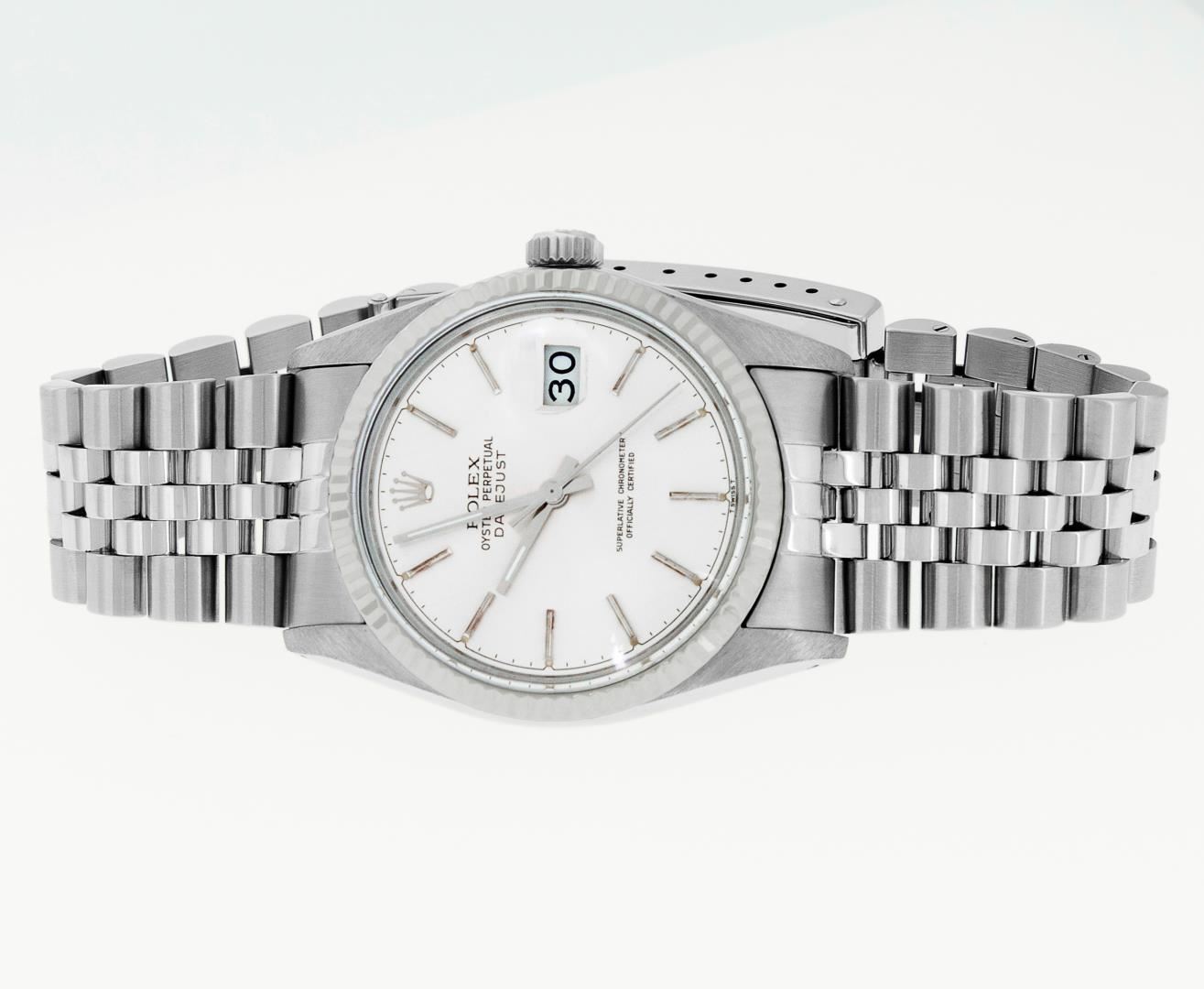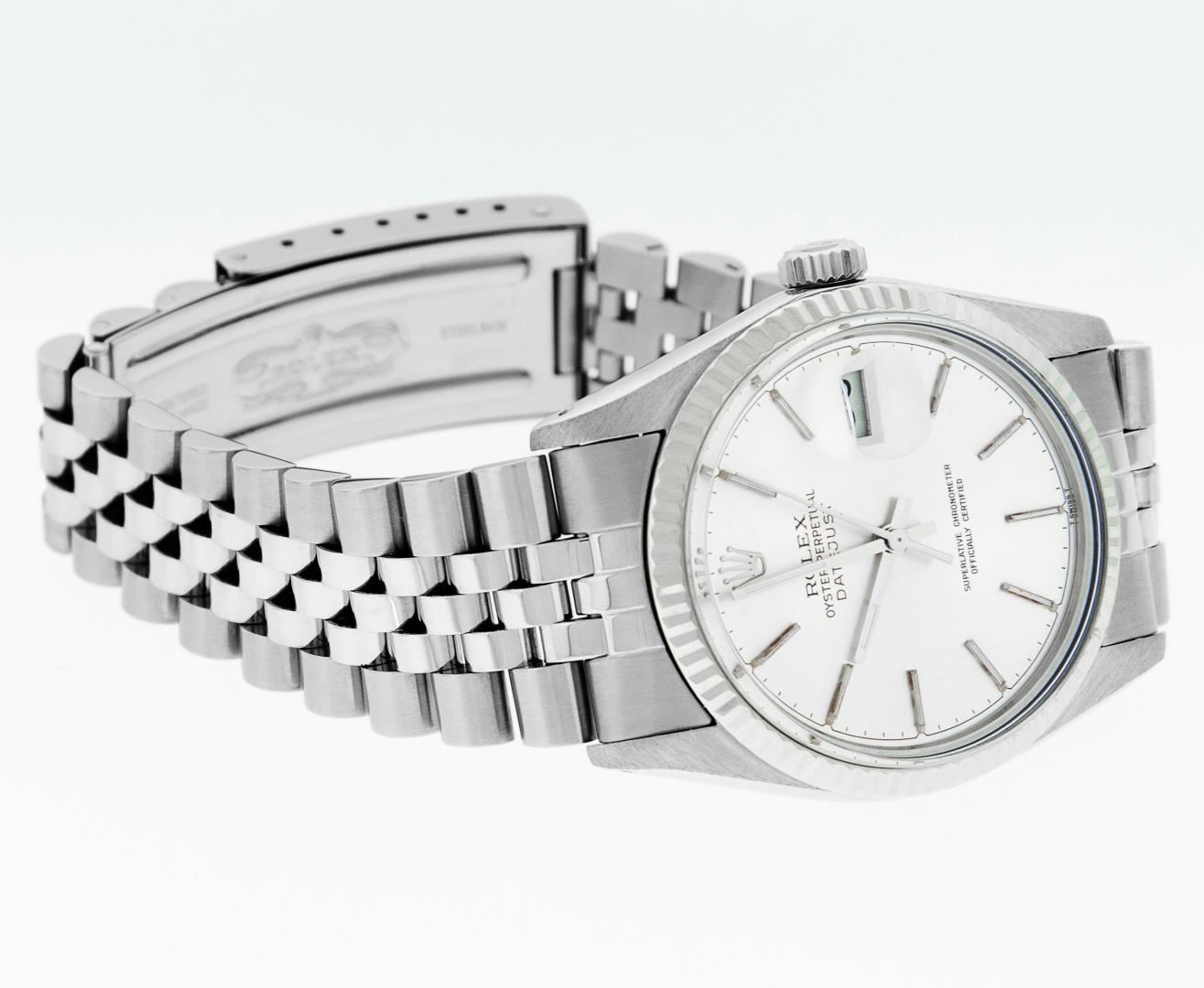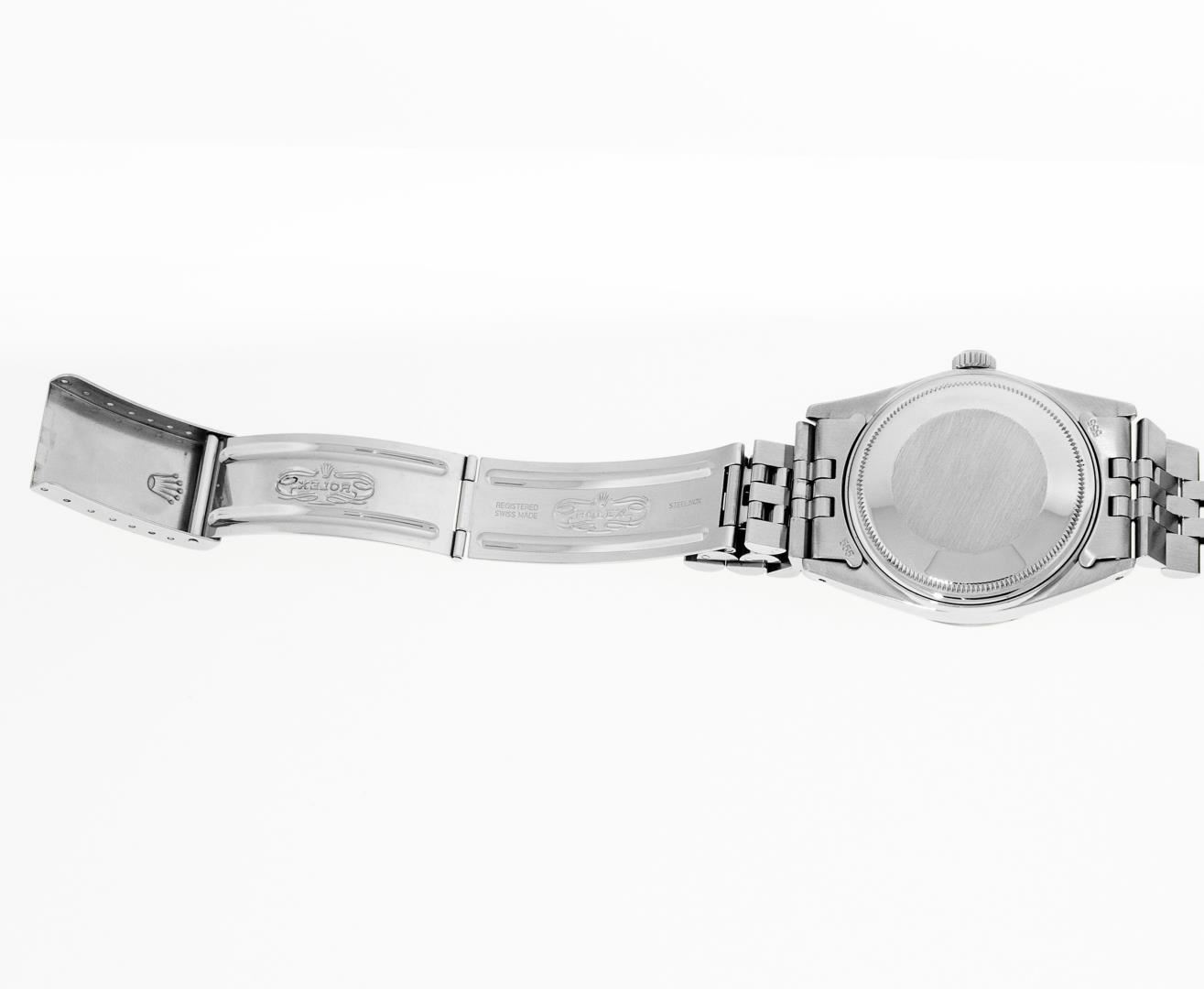 One Mens Pre Owned Stainless Steel Rolex Datejust Polished, Serviced & Electronically Tested, Rolex Stainless Steel Case: 36mm, Rolex Stainless Steel Crown, Bezel: 14K White Gold Fluted Bezel. Custom Crystal: Acrylic Crystal With Magnified Date Window, Custom Hands: New Luminescent Hands. Rolex Movement: Automatic Winding Movement 3035. Rolex Dial: Silver Index With Dash Track & Lumi Dot. Date Window: 3 O'Clock Position Date Display, Quickset, Model: Datejust, Condition: G-6 Extra Fine. Rolex Bracelet: Stainless Steel Jubilee Band. Bright Polish & Satin Finish. 7.0 Inch Length, Adjustable. Standard Clasp, With Rolex Logo. This Watch Has Been Serviced Time Tested And Is In Excellent Condition It Is Free Of All Scratches And Dents.
