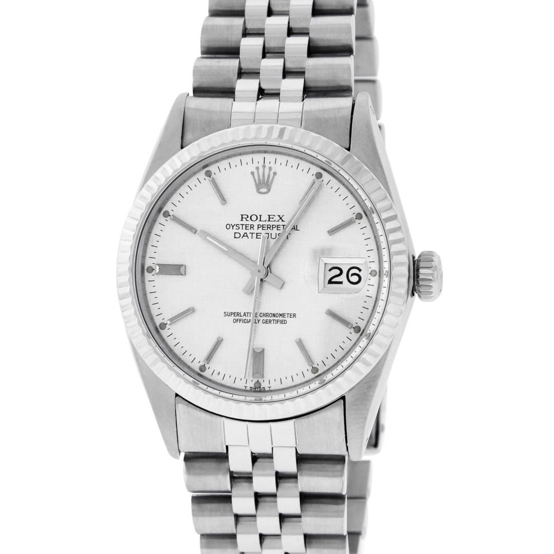 One Mens Pre Owned Stainless Steel Rolex Datejust Polished, Serviced & Electronically Tested, Rolex Stainless Steel Case: 36mm, Rolex Stainless Steel Crown, Bezel: 14K White Gold Fluted Bezel. Custom Crystal: Acrylic Crystal With Date Window, Custom Hands: New Luminescent Hands. Rolex Movement: Automatic Winding Movement 3035. Rolex Dial: Silver Index With Dash Track & Lumi Dot. Date Window: 3 O'Clock Position Date Display, Quickset, Model: Datejust, Condition: G-6 Extra Fine. Rolex Bracelet: Stainless Steel Jubilee Band. Bright Polish & Satin Finish. 7.0 Inch Length, Adjustable. Standard Clasp, With Rolex Logo. This Watch Has Been Serviced Time Tested And Is In Excellent Condition It Is Free Of All Scratches And Dents.