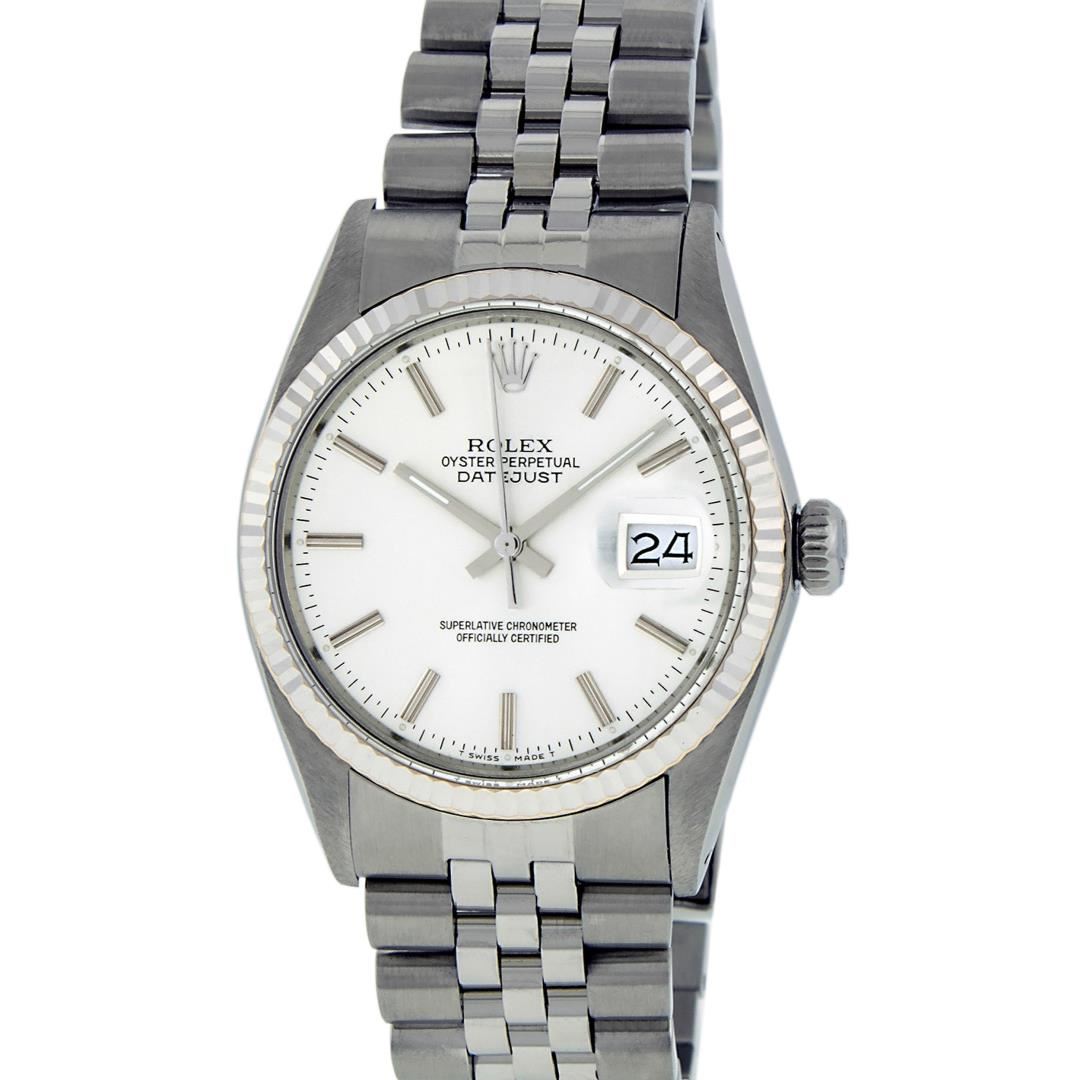 One Mens Pre Owned Stainless Steel Rolex Datejust Polished, Serviced & Electronically Tested, Rolex Stainless Steel Case: 36mm, Rolex Stainless Steel Crown, Rolex Bezel: 14K White Gold Fluted Bezel. Custom Crystal: New Acrylic With Date Window. Custom Hands: New Luminescent Hands. Rolex Movement: Automatic Winding Movement 3035. Rolex Dial: Silver Index With Dash Track And Lumi Dots. Date Window: 3 O'Clock Position Date Display, Quickset, Model: Datejust, Condition: G-6 Extra Fine. Rolex Bracelet: Stainless Steel Jubilee Band. Bright Polish & Satin Finish. 7.0 Inch Length, Adjustable. Standard Clasp, With Rolex Logo. This Watch Has Been Serviced Time Tested And Is In Excellent Condition It Is Free Of All Scratches And Dents.