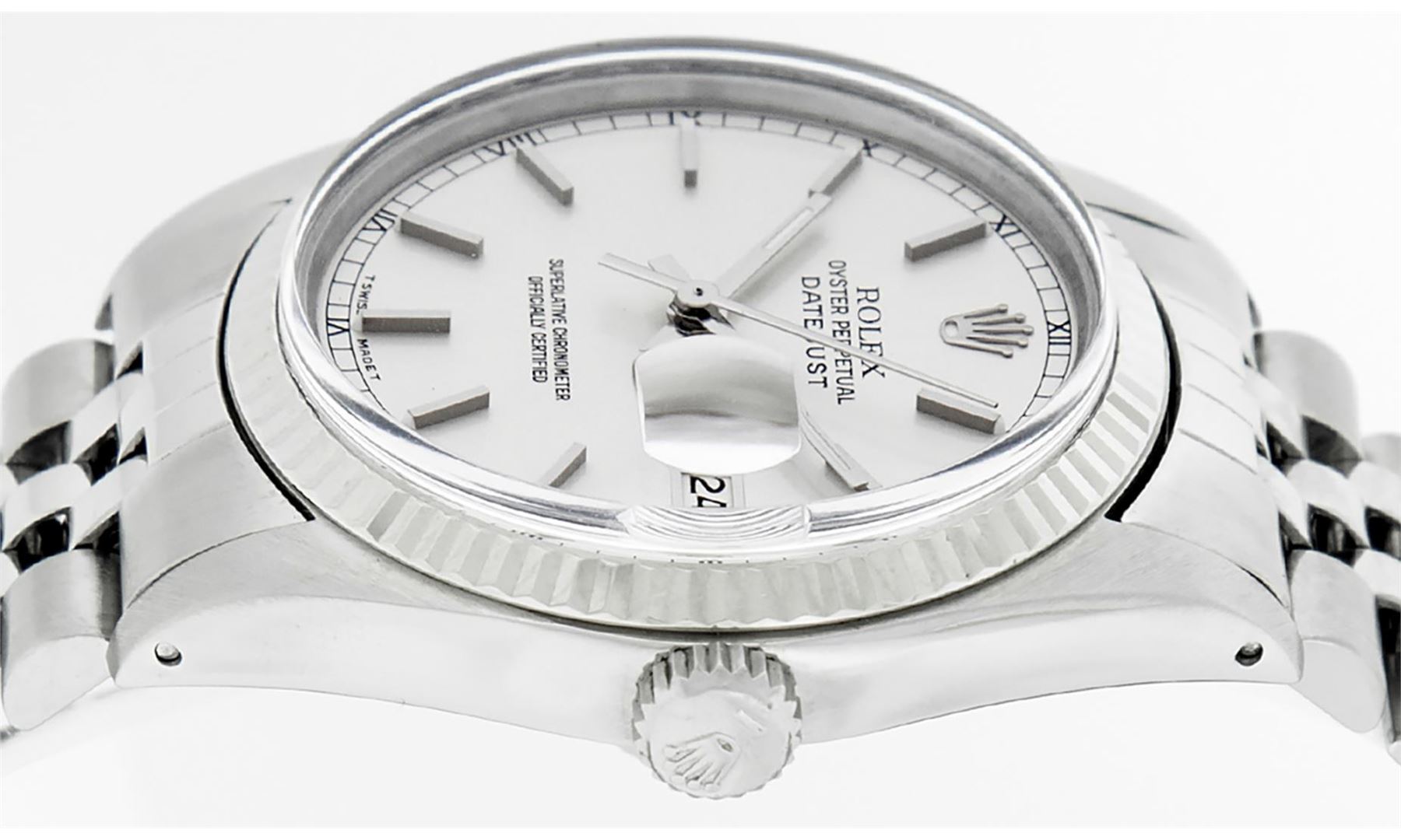One Mens Pre Owned Rolex Stainless Steel Rolex Datejust Polished, Serviced & Electronically Tested, Rolex Stainless Steel Case: 36mm, Rolex Stainless Steel Crown, Rolex Bezel: 14K White Gold Fluted Bezel. Custom Crystal: New Acrylic With Magnified Date Window. Hands: Luminescent Hands. Rolex Movement: Automatic Winding Movement 3035. Rolex Dial: Silver Index With Roman Square Track. Date Window: 3 O'Clock Position Date Display, Quickset, Model: Datejust, Condition: G-6 Extra Fine. Rolex Bracelet: Stainless Steel Jubilee Band. Bright Polish & Satin Finish. 7.0 Inch Length, Adjustable. Standard Clasp, With Rolex Logo. This Watch Has Been Serviced Time Tested And Is In Excellent Condition It Is Free Of All Scratches And Dents.