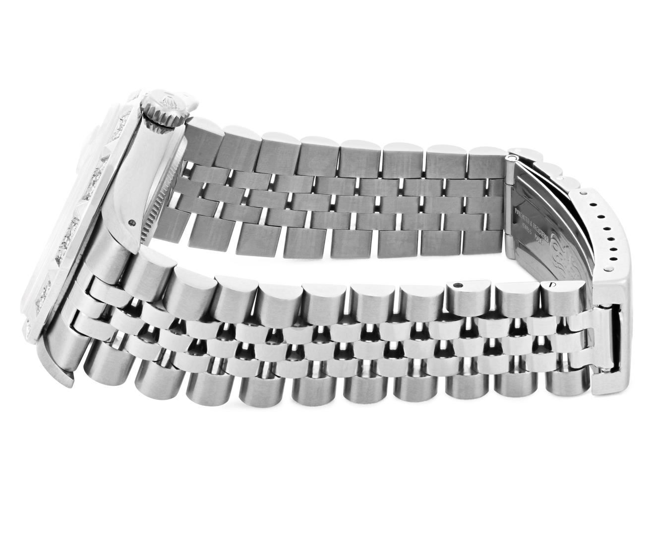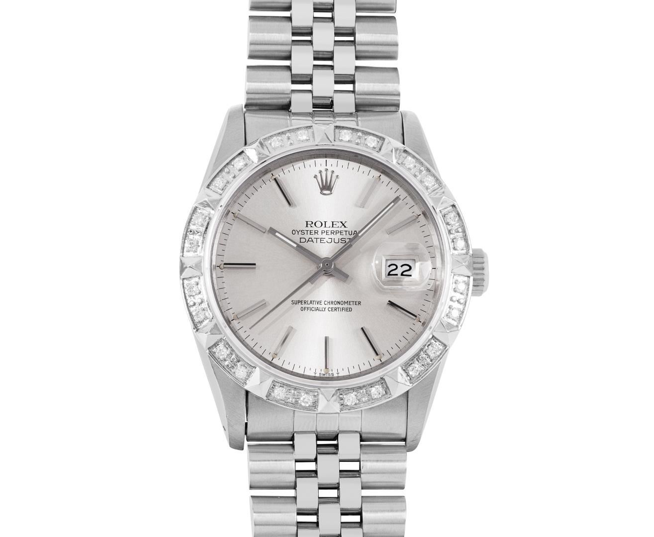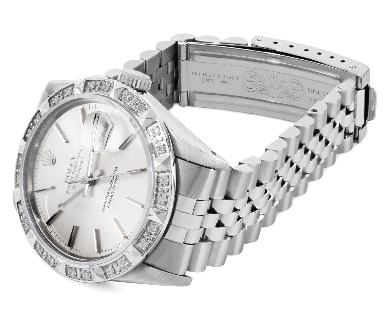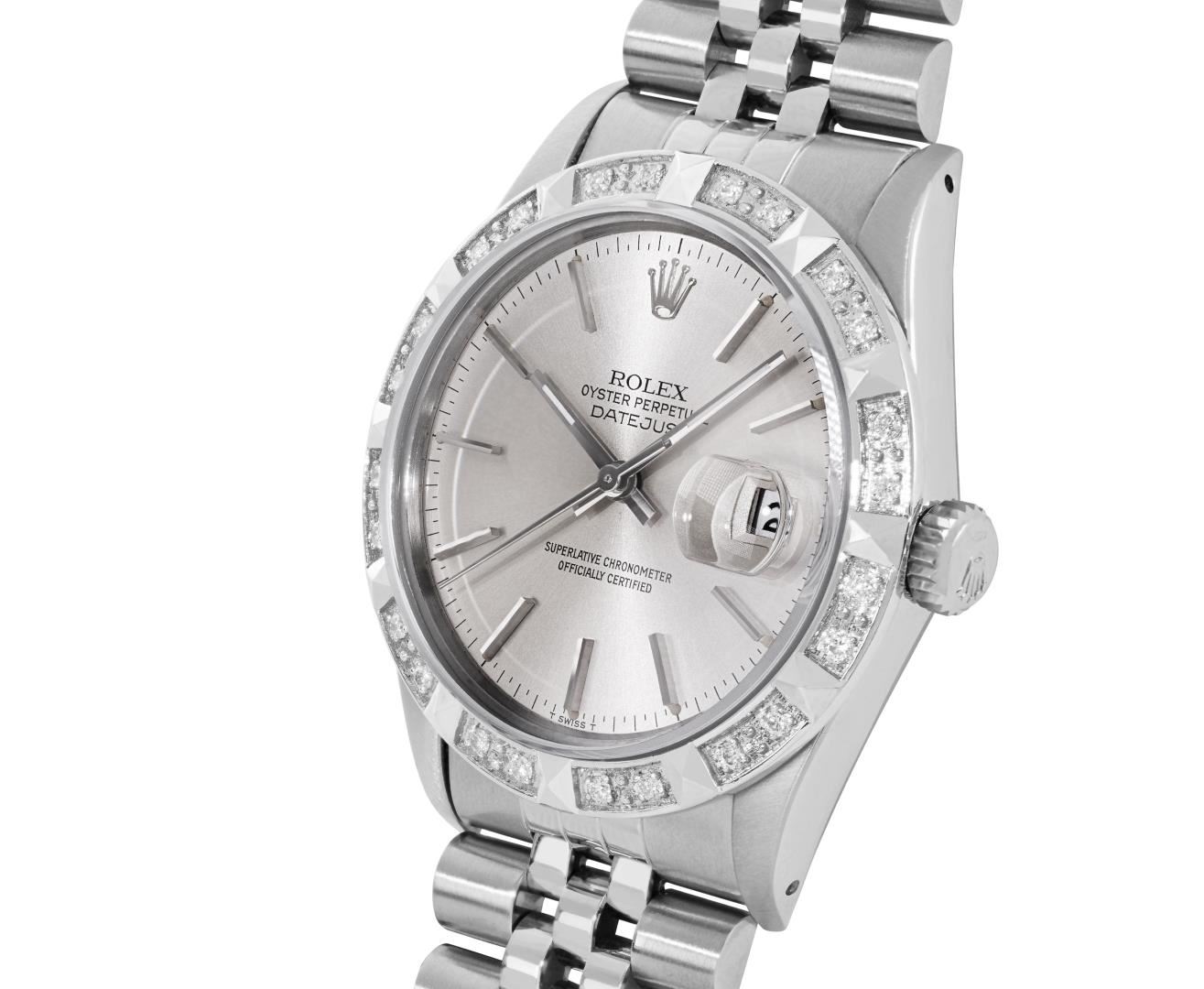 One Mens Pre Owned Rolex Stainless Steel Datejust Polished Bright with Satin Finish, Serviced & Electronically Tested, Rolex Stainless Steel Case: 36mm, Rolex Stainless Steel Crown, Custom Bezel: New 18K White Gold Pyramid Bezel, Diamond Count: 24 Diamond on Bezel. Custom Crystal: New Sapphire With Magnified Date Window. Rolex Movement: Automatic Winding Movement Caliber 3035. Rolex Dial: Silver Index Dial With Open Track and Lumi Dots. Custom Hands: New Lumi Hands. Date Window: 3 O'Clock Position Date Display, Quickset, Model: Quickset Datejust. Condition: G-6 Extra Fine. Rolex Bracelet: Stainless Steel Jubilee Band. Bright Polish & Satin Finish. 7.0 Inch Length, Adjustable. Fold Clasp, With Rolex Logo. This Pre Owned Watch Has Been Serviced Time Tested And Is In Excellent Condition It Is Free Of All Scratches And Dents. This Watch Comes With A Rolex Box.