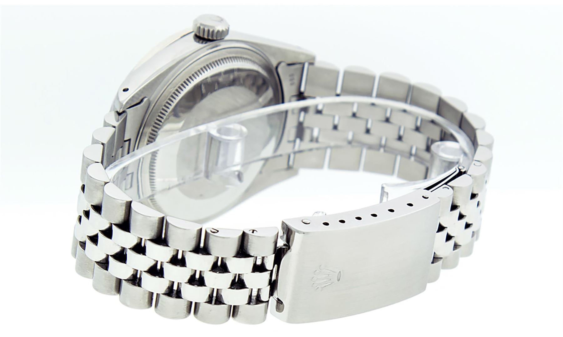 One Mens Pre Owned Stainless Steel Rolex Datejust Polished Bright with Satin Finish, This Watch Has Been Serviced & Electronically Tested, Rolex Stainless Steel Case: 36mm, Rolex Stainless Steel Crown, Custom Bezel: New 18K White Gold Emerald Beadset Diam