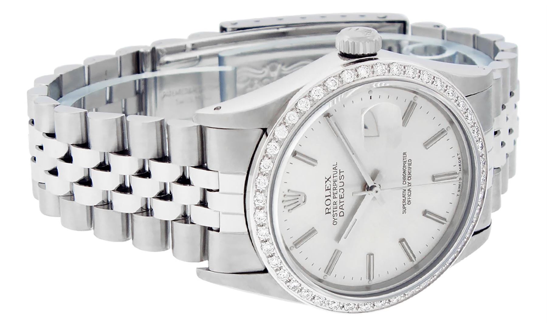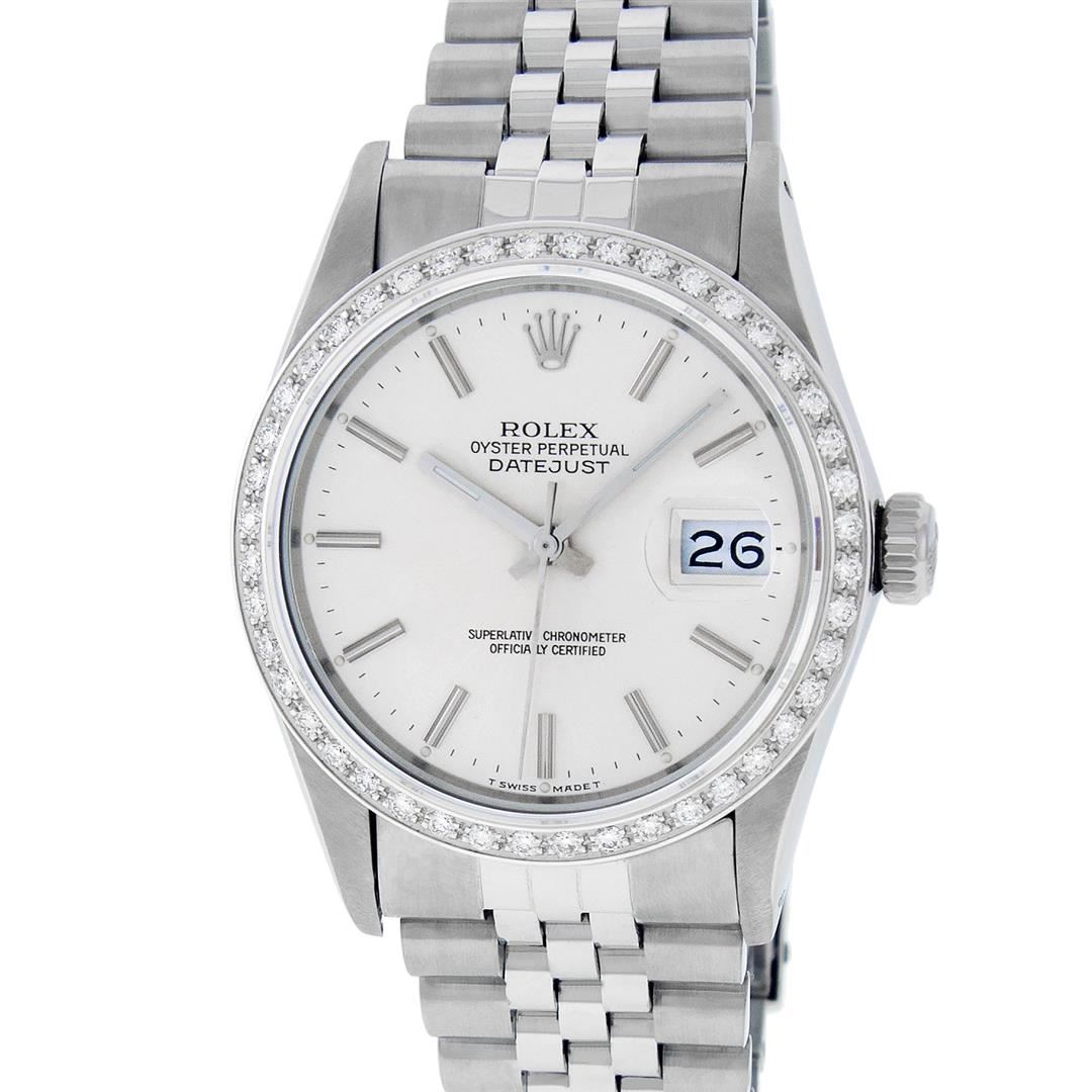 One Mens Pre Owned Stainless Steel Rolex Datejust Polished Bright with Satin Finish, This Watch Has Been Serviced & Electronically Tested, Rolex Stainless Steel Case: 36mm, Rolex Stainless Steel Crown, Custom Bezel: New 18K White Gold Beadset Diamond Beze