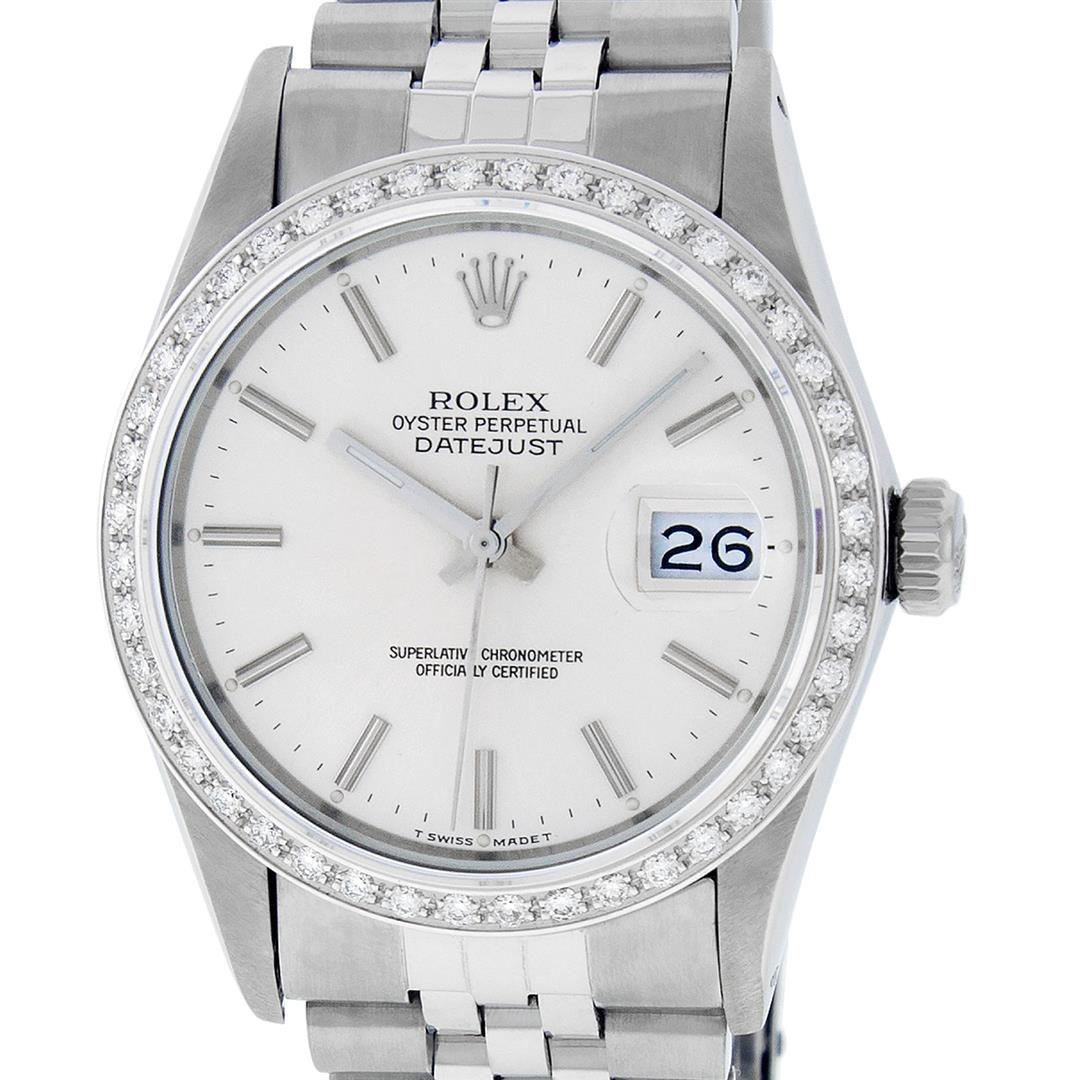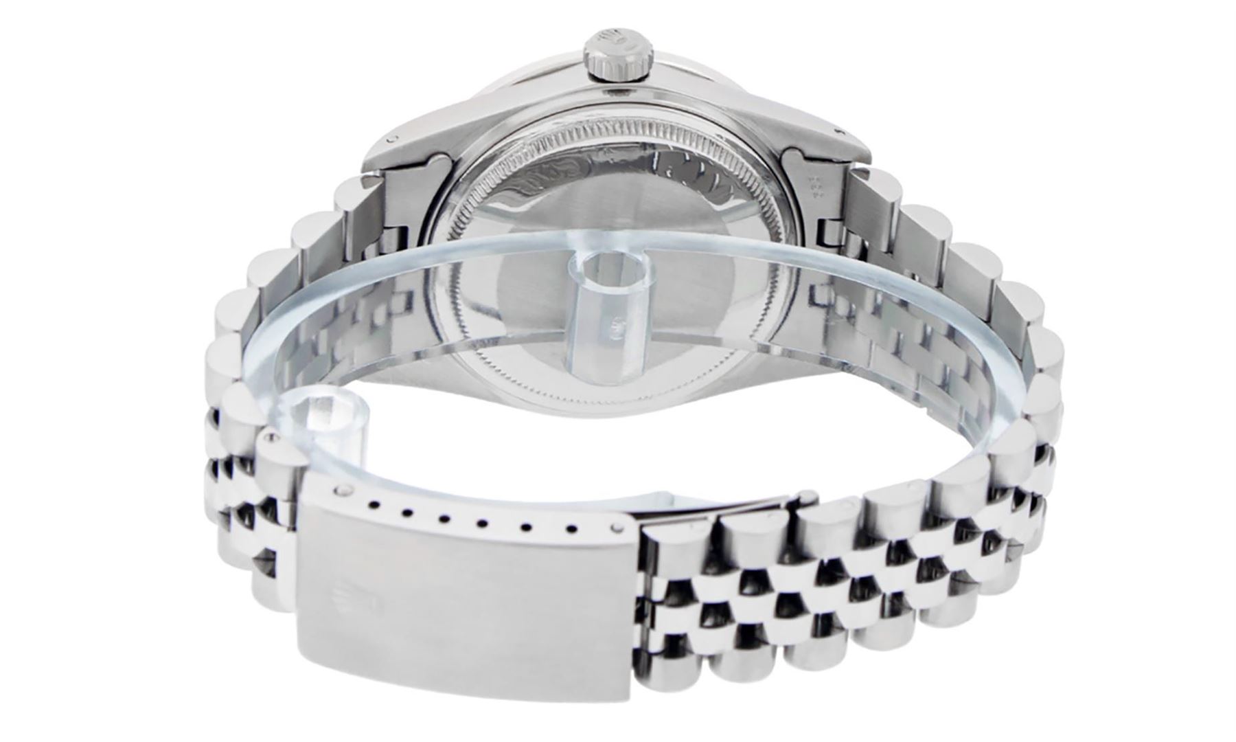 One Mens Pre Owned Stainless Steel Rolex Datejust Polished Bright with Satin Finish, This Watch Has Been Serviced & Electronically Tested, Rolex Stainless Steel Case: 36mm, Rolex Stainless Steel Crown, Custom Bezel: New 18K White Gold Beadset Diamond Beze