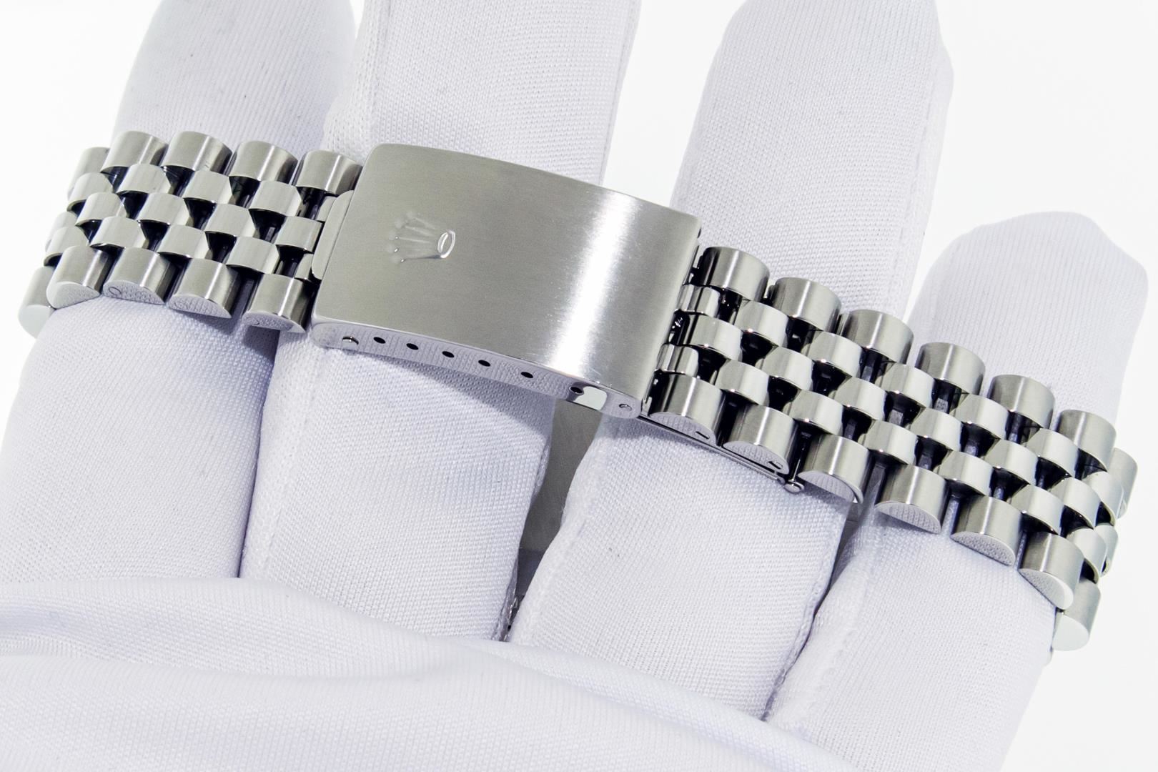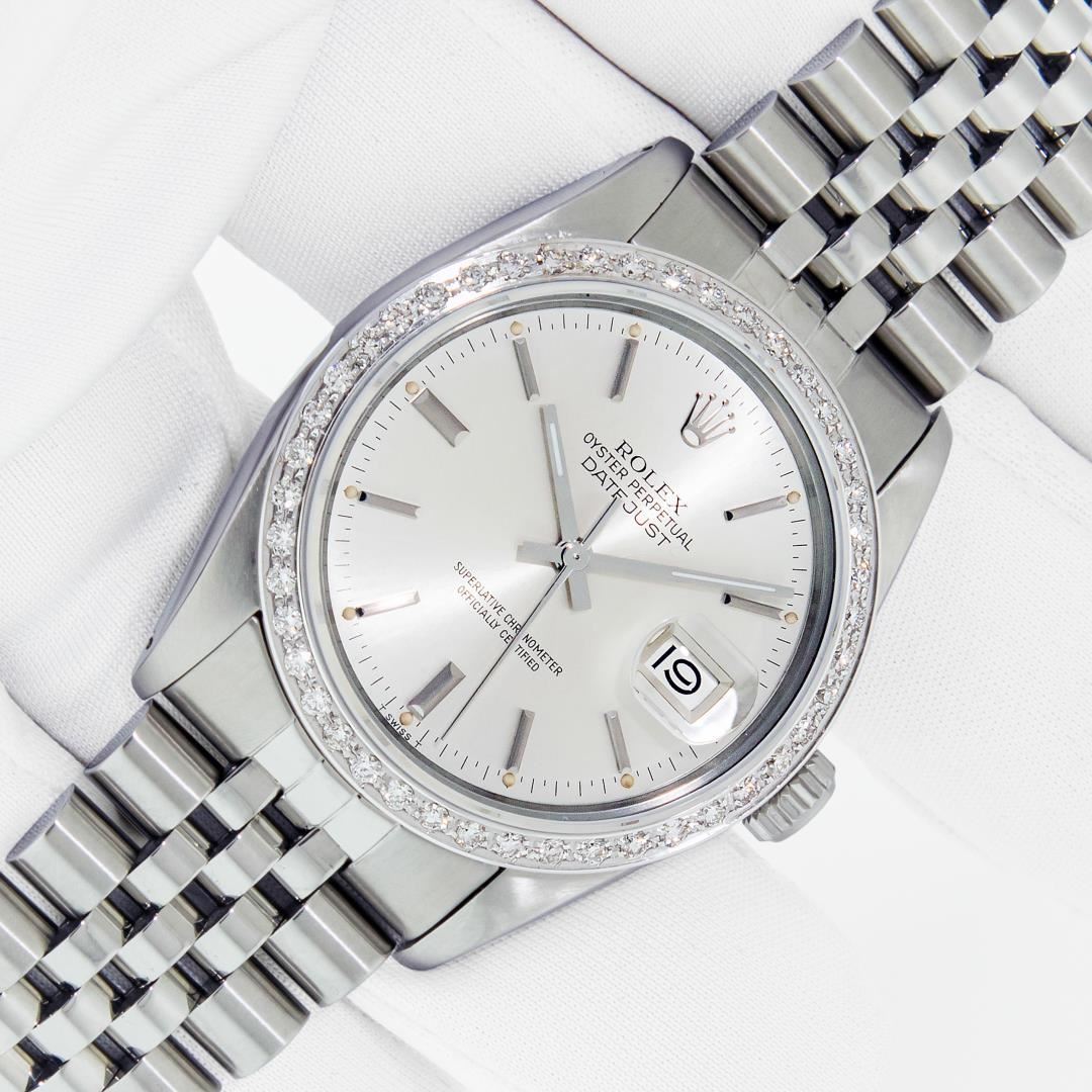 One Mens Pre Owned Rolex Datejust Polished Bright with Satin Finish, This Watch Has Been Serviced & Electronically Tested, Rolex Stainless Steel Case: 36mm, Rolex Stainless Steel Crown, Custom Bezel: New 18K White Gold Bead-set Diamond Bezel, Diamond Count: 44 Diamonds, Clarity: SI-VS, Color: G to H. Custom Crystal: New Sapphire With Date Window. Custom Hands: New Luminescent Hands. Rolex Movement: Automatic Winding Movement. Rolex Dial: Silver Index Dial With Dash Track And Lumi Dot. Date Window: 3 O'Clock Position Date Display, Quickset, Model: Datejust, Condition: G-6 Extra Fine. Rolex Bracelet: Stainless Steel Jubilee Band. Bracelet: 7.0 Inch Length, Adjustable. Standard Clasp, With Rolex Logo. This Watch Has Been Serviced Time Tested And Is In Excellent Condition It Is Free Of All Scratches And Dents.