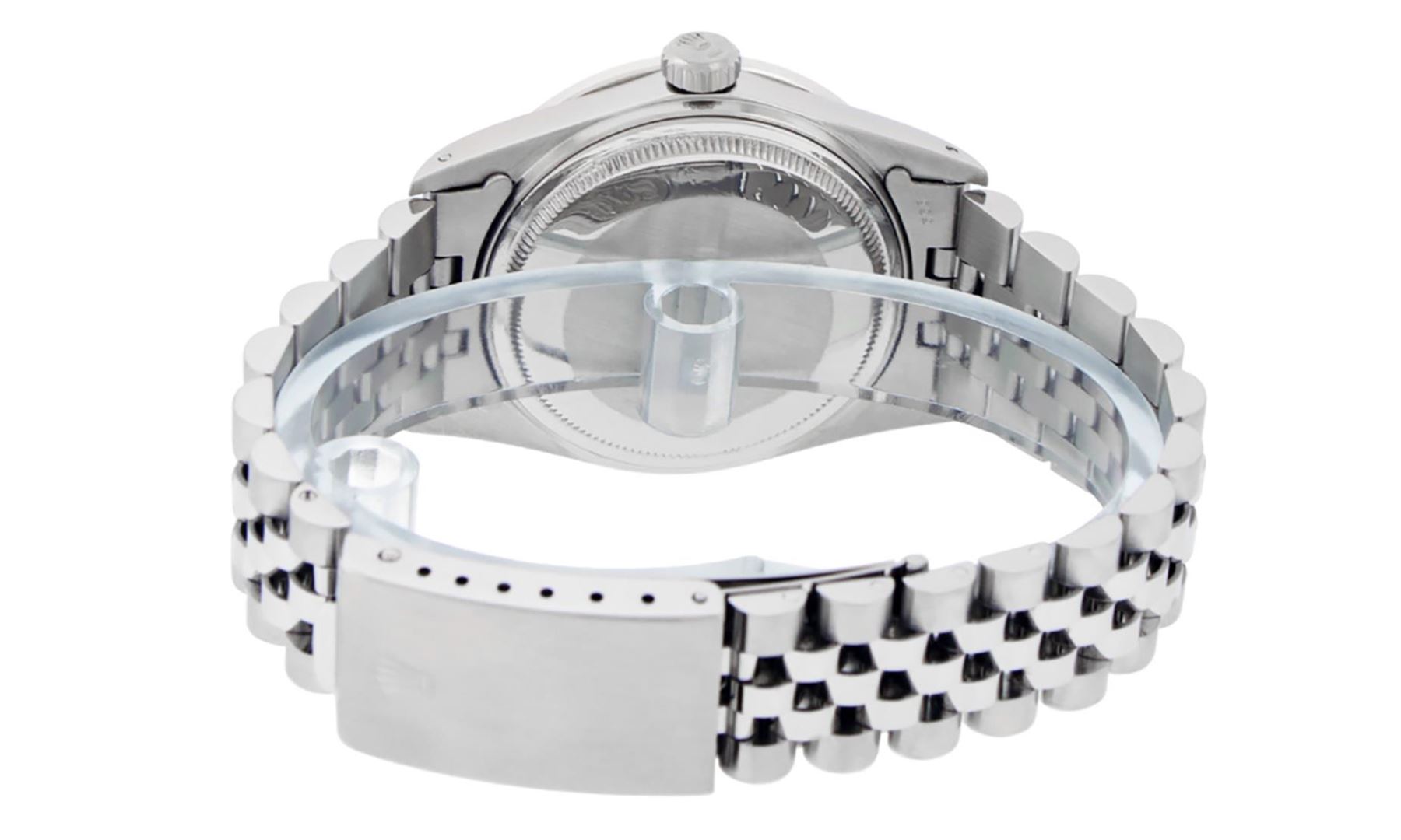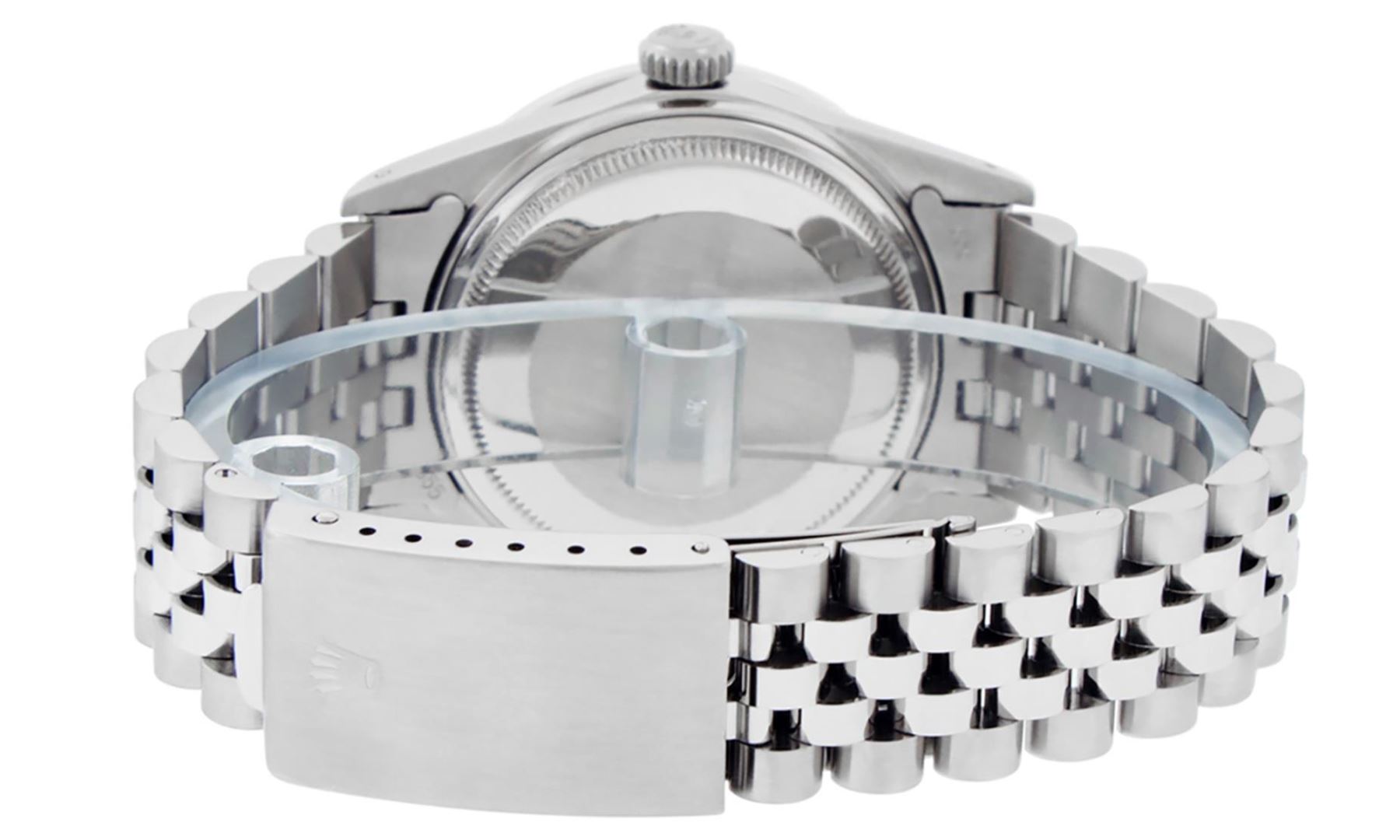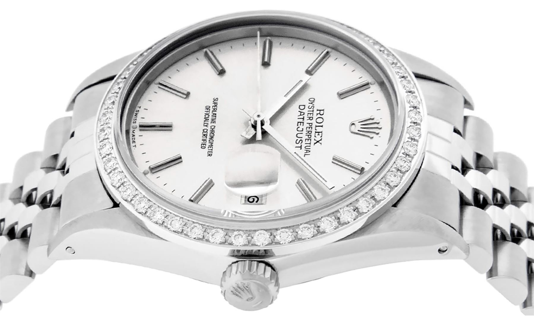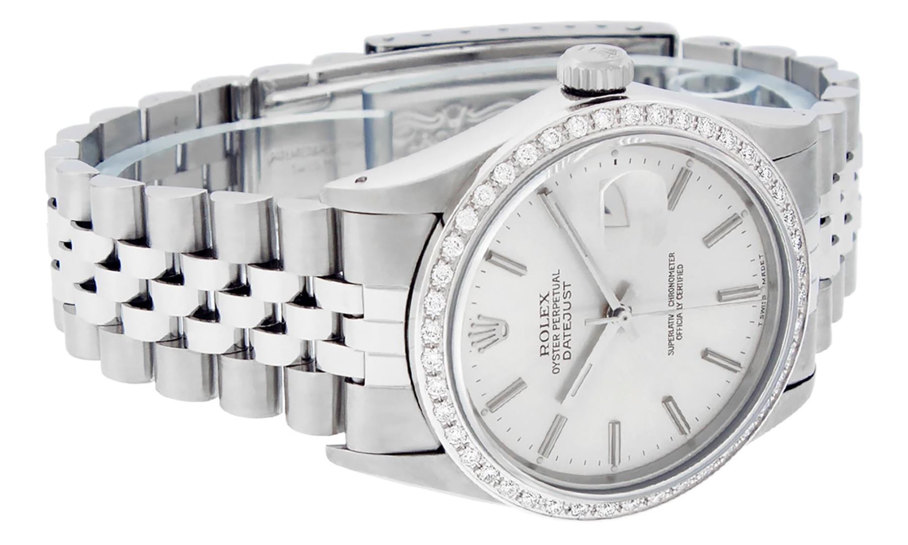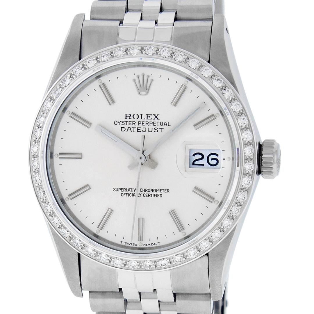 One Mens Pre Owned Stainless Steel Rolex Datejust Polished Bright with Satin Finish, This Watch Has Been Serviced & Electronically Tested, Rolex Stainless Steel Case: 36mm, Rolex Stainless Steel Crown, Custom Bezel: New 18K White Gold Beadset Diamond Bezel, Diamond Count: 44 Diamonds, Total Weight 1.00 Carat, Clarity: SI-VS, Color: G to H. Custom Crystal: New Sapphire With Magnified Date Window. Custom Hands: New Luminescent Hands. Rolex Movement: Automatic Winding Movement 3035. Rolex Dial: Silver Index With Dash Track & Lumi Dot. Date Window: 3 O'Clock Position Date Display, Quickset, Model: Datejust, Condition: G-6 Extra Fine. Rolex Bracelet: Stainless Steel Jubilee Band. Bracelet: 7.0 Inch Length, Adjustable. Standard Clasp, With Rolex Logo. This Watch Has Been Serviced Time Tested And Is In Excellent Condition It Is Free Of All Scratches And Dents.