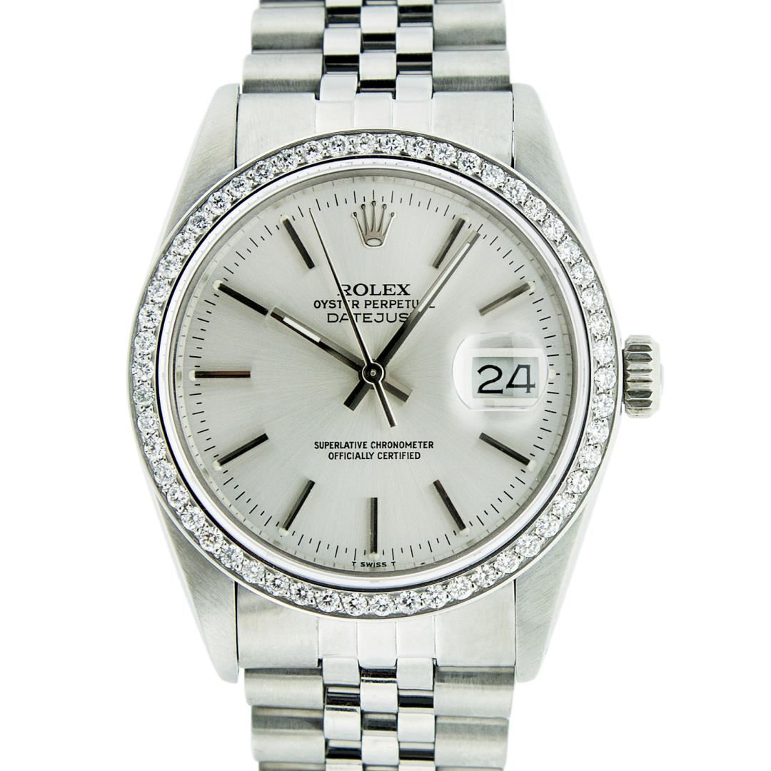 One Mens Pre Owned Rolex Stainless Steel Datejust Polished Bright with Satin Finish, This Watch Has Been Serviced & Electronically Tested, Stainless Steel Case: 36mm, Rolex Stainless Steel Crown, Custom Bezel: New Stainless Steel Beadset Diamond Bezel, Diamond Count: 54 Diamonds, Total Weight 1.00 Carat, Clarity: SI-VS, Color: G to H. Custom Crystal: New Sapphire With Magnified Date Window. Custom Hands: New Luminescent Hands. Rolex Movement: Automatic Winding Movement 3035. Rolex Dial: Silver Index Dial With Lumi Dots & Dash Track. Date Window: 3 O'Clock Position Date Display, Quickset, Model: Datejust. Condition: G-6 Extra Fine. Rolex Bracelet: Stainless Steel Jubilee Band. Bright Polish & Satin Finish. 7.0 Inch Length, Adjustable. Standard Clasp, With Rolex Logo. This Watch Has Been Serviced Time Tested And Is In Excellent Condition It Is Free Of All Scratches And Dents.