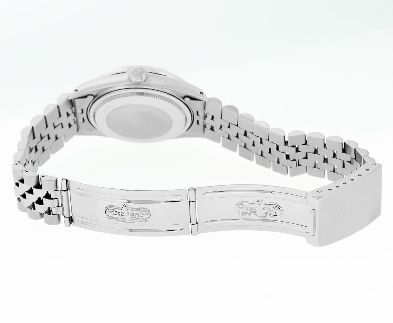 One Mens Pre Owned Stainless Steel Rolex Datejust Polished, Serviced & Electronically Tested, Rolex Stainless Steel Case: 36mm, Rolex Stainless Steel Crown, Custom Bezel: New 18K White Gold Beadset Diamond Bezel, Diamond Count: 44 Diamonds, Total Weight 1.00 Carat, Clarity: SI-VS, Color: G to H. Custom Crystal: New Sapphire With Magnified Date Window. Custom Hands: New Luminescent Hands. Rolex Movement: Automatic Winding Movement 3035. Rolex Dial: Silver Index With Dash Track And Lumi Dot. Date Window: 3 O'Clock Position Date Display, Quickset, Model: Datejust, Condition: G-6 Extra Fine. Rolex Bracelet: Stainless Steel Jubilee Band. Bright Polish & Satin Finish. 7.0 Inch Length, Adjustable. Standard Clasp, With Rolex Logo. This Watch Has Been Serviced Time Tested And Is In Excellent Condition It Is Free Of All Scratches And Dents.