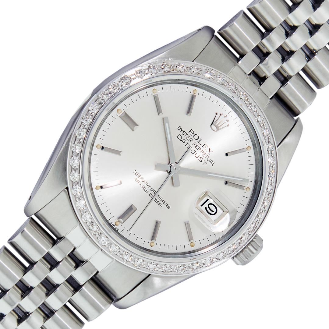 One Mens Pre Owned Rolex Datejust Polished Bright with Satin Finish, This Watch Has Been Serviced & Electronically Tested, Rolex Stainless Steel Case: 36mm, Rolex Stainless Steel Crown, Custom Bezel: New 18K White Gold Bead-set Diamond Bezel, Diamond Count: 44 Diamonds, Clarity: SI-VS, Color: G to H. Custom Crystal: New Sapphire With Date Window. Custom Hands: New Luminescent Hands. Rolex Movement: Automatic Winding Movement. Rolex Dial: Silver Index Dial With Dash Track And Lumi Dot. Date Window: 3 O'Clock Position Date Display, Quickset, Model: Datejust, Condition: G-6 Extra Fine. Rolex Bracelet: Stainless Steel Jubilee Band. Bracelet: 7.0 Inch Length, Adjustable. Standard Clasp, With Rolex Logo. This Watch Has Been Serviced Time Tested And Is In Excellent Condition It Is Free Of All Scratches And Dents.
