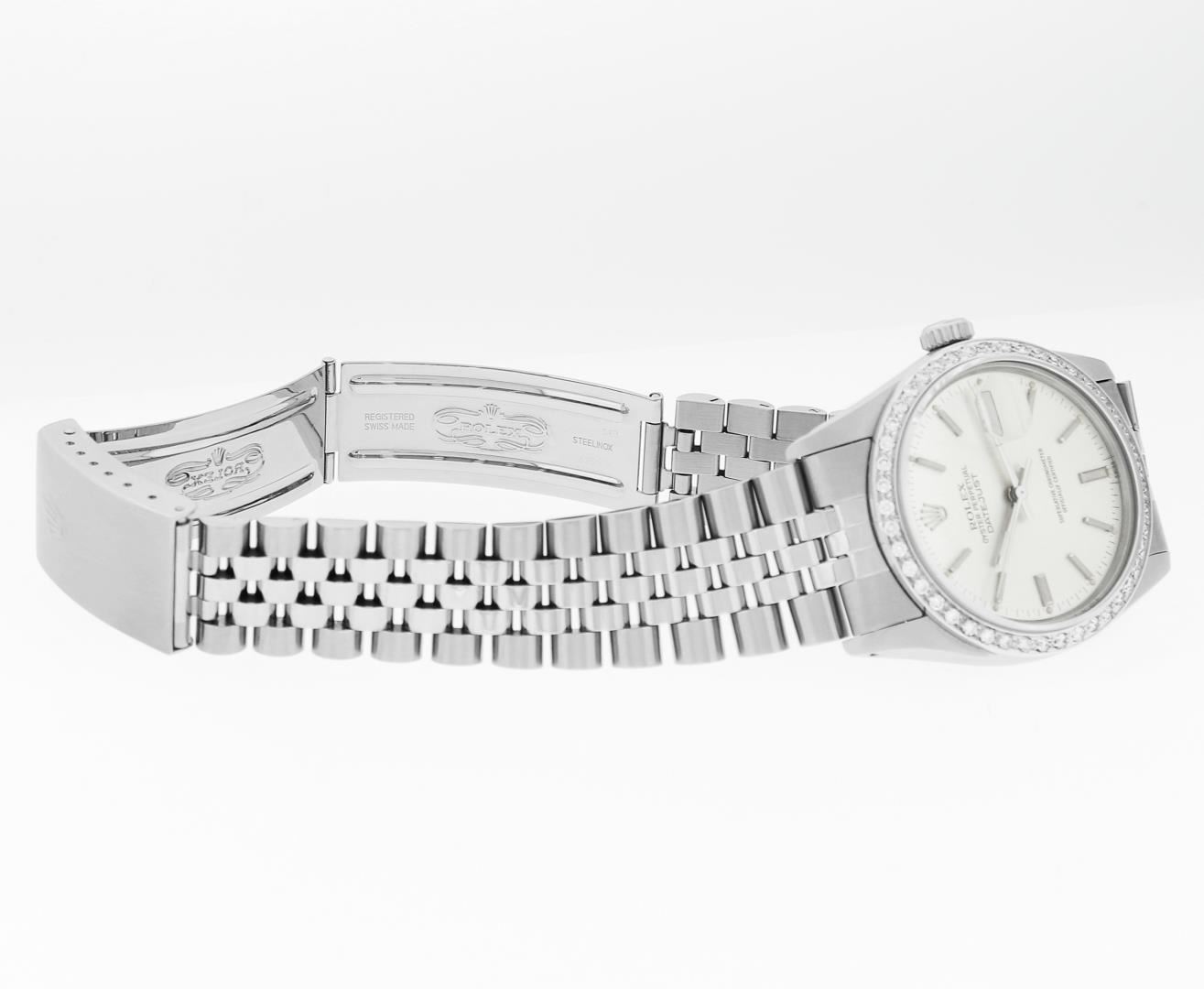 One Mens Pre Owned Stainless Steel Rolex Datejust Polished, Serviced & Electronically Tested, Rolex Stainless Steel Case: 36mm, Rolex Stainless Steel Crown, Custom Bezel: New 18K White Gold Beadset Diamond Bezel, Diamond Count: 44 Diamonds, Total Weight 1.00 Carat, Clarity: SI-VS, Color: G to H. Custom Crystal: New Sapphire With Magnified Date Window. Custom Hands: New Luminescent Hands. Rolex Movement: Automatic Winding Movement 3035. Rolex Dial: Silver Index With Dash Track And Lumi Dot. Date Window: 3 O'Clock Position Date Display, Quickset, Model: Datejust, Condition: G-6 Extra Fine. Rolex Bracelet: Stainless Steel Jubilee Band. Bright Polish & Satin Finish. 7.0 Inch Length, Adjustable. Standard Clasp, With Rolex Logo. This Watch Has Been Serviced Time Tested And Is In Excellent Condition It Is Free Of All Scratches And Dents.