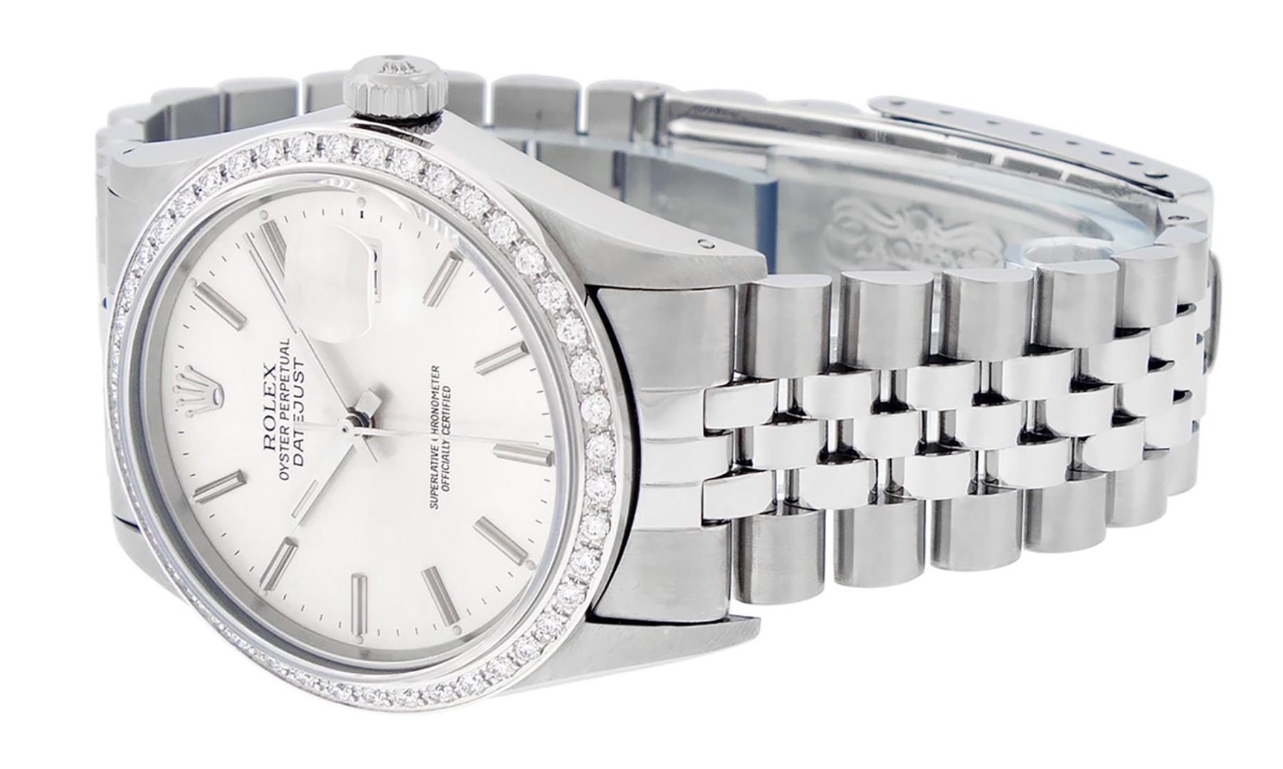 One Mens Pre Owned Stainless Steel Rolex Datejust Polished Bright with Satin Finish, This Watch Has Been Serviced & Electronically Tested, Rolex Stainless Steel Case: 36mm, Rolex Stainless Steel Crown, Custom Bezel: New 18K White Gold Beadset Diamond Bezel, Diamond Count: 44 Diamonds, Total Weight 1.00 Carat, Clarity: SI-VS, Color: G to H. Custom Crystal: New Sapphire With Magnified Date Window. Custom Hands: New Luminescent Hands. Rolex Movement: Automatic Winding Movement 3035. Rolex Dial: Silver Index With Dash Track & Lumi Dot. Date Window: 3 O'Clock Position Date Display, Quickset, Model: Datejust, Condition: G-6 Extra Fine. Rolex Bracelet: Stainless Steel Jubilee Band. Bracelet: 7.0 Inch Length, Adjustable. Standard Clasp, With Rolex Logo. This Watch Has Been Serviced Time Tested And Is In Excellent Condition It Is Free Of All Scratches And Dents.