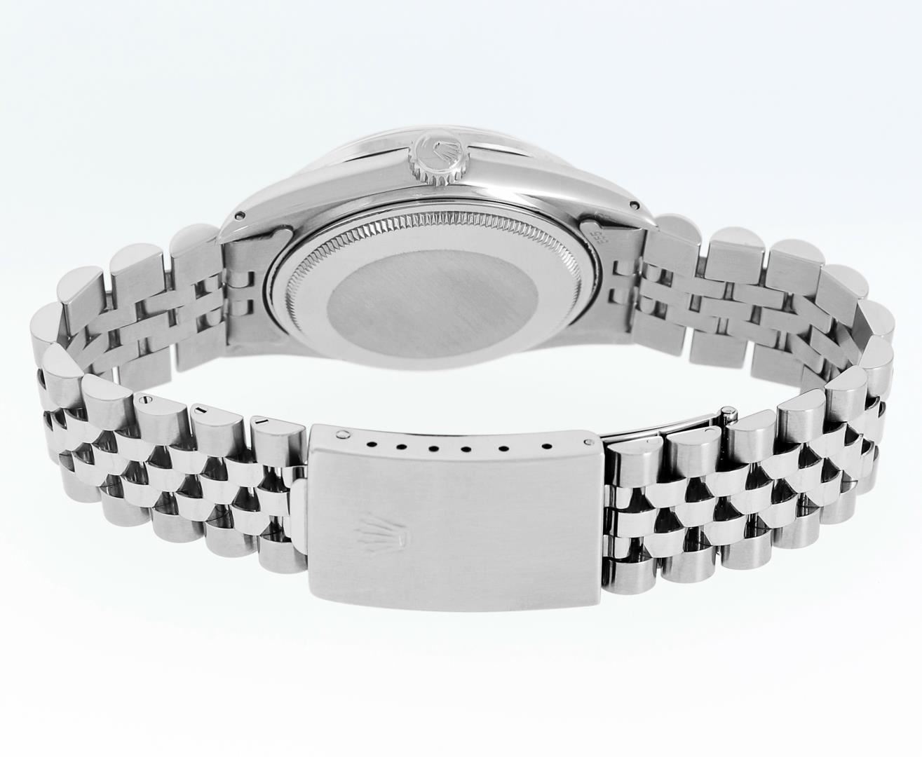 One Mens Pre Owned Stainless Steel Rolex Datejust Polished, Serviced & Electronically Tested, Rolex Stainless Steel Case: 36mm, Rolex Stainless Steel Crown, Custom Bezel: New 18K White Gold Beadset Diamond Bezel, Diamond Count: 44 Diamonds, Total Weight 1.00 Carat, Clarity: SI-VS, Color: G to H. Custom Crystal: New Sapphire With Magnified Date Window. Custom Hands: New Luminescent Hands. Rolex Movement: Automatic Winding Movement 3035. Rolex Dial: Silver Index With Dash Track And Lumi Dot. Date Window: 3 O'Clock Position Date Display, Quickset, Model: Datejust, Condition: G-6 Extra Fine. Rolex Bracelet: Stainless Steel Jubilee Band. Bright Polish & Satin Finish. 7.0 Inch Length, Adjustable. Standard Clasp, With Rolex Logo. This Watch Has Been Serviced Time Tested And Is In Excellent Condition It Is Free Of All Scratches And Dents.