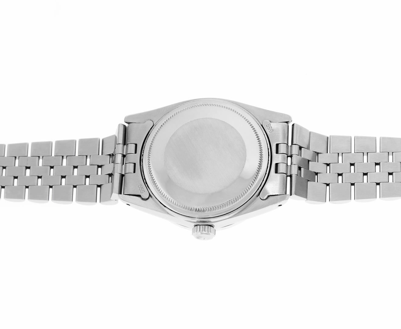 One Mens Pre Owned Stainless Steel Rolex Datejust Polished, Serviced & Electronically Tested, Rolex Stainless Steel Case: 36mm, Rolex Stainless Steel Crown, Custom Bezel: New 18K White Gold Beadset Diamond Bezel, Diamond Count: 44 Diamonds, Total Weight 1.00 Carat, Clarity: SI-VS, Color: G to H. Custom Crystal: New Sapphire With Magnified Date Window. Custom Hands: New Luminescent Hands. Rolex Movement: Automatic Winding Movement 3035. Rolex Dial: Silver Index With Dash Track And Lumi Dot. Date Window: 3 O'Clock Position Date Display, Quickset, Model: Datejust, Condition: G-6 Extra Fine. Rolex Bracelet: Stainless Steel Jubilee Band. Bright Polish & Satin Finish. 7.0 Inch Length, Adjustable. Standard Clasp, With Rolex Logo. This Watch Has Been Serviced Time Tested And Is In Excellent Condition It Is Free Of All Scratches And Dents.