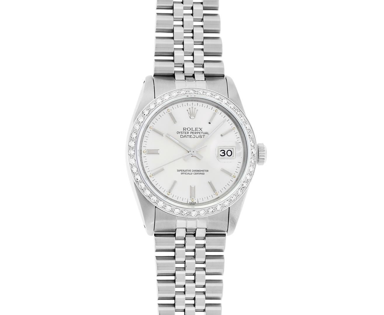 One Mens Pre Owned Stainless Steel Rolex Datejust Polished, Serviced & Electronically Tested, Rolex Stainless Steel Case: 36mm, Rolex Stainless Steel Crown, Custom Bezel: New 18K White Gold Beadset Diamond Bezel, Diamond Count: 44 Diamonds, Total Weight 1.00 Carat, Clarity: SI-VS, Color: G to H. Custom Crystal: New Sapphire With Magnified Date Window. Custom Hands: New Luminescent Hands. Rolex Movement: Automatic Winding Movement 3035. Rolex Dial: Silver Index With Dash Track And Lumi Dot. Date Window: 3 O'Clock Position Date Display, Quickset, Model: Datejust, Condition: G-6 Extra Fine. Rolex Bracelet: Stainless Steel Jubilee Band. Bright Polish & Satin Finish. 7.0 Inch Length, Adjustable. Standard Clasp, With Rolex Logo. This Watch Has Been Serviced Time Tested And Is In Excellent Condition It Is Free Of All Scratches And Dents.
