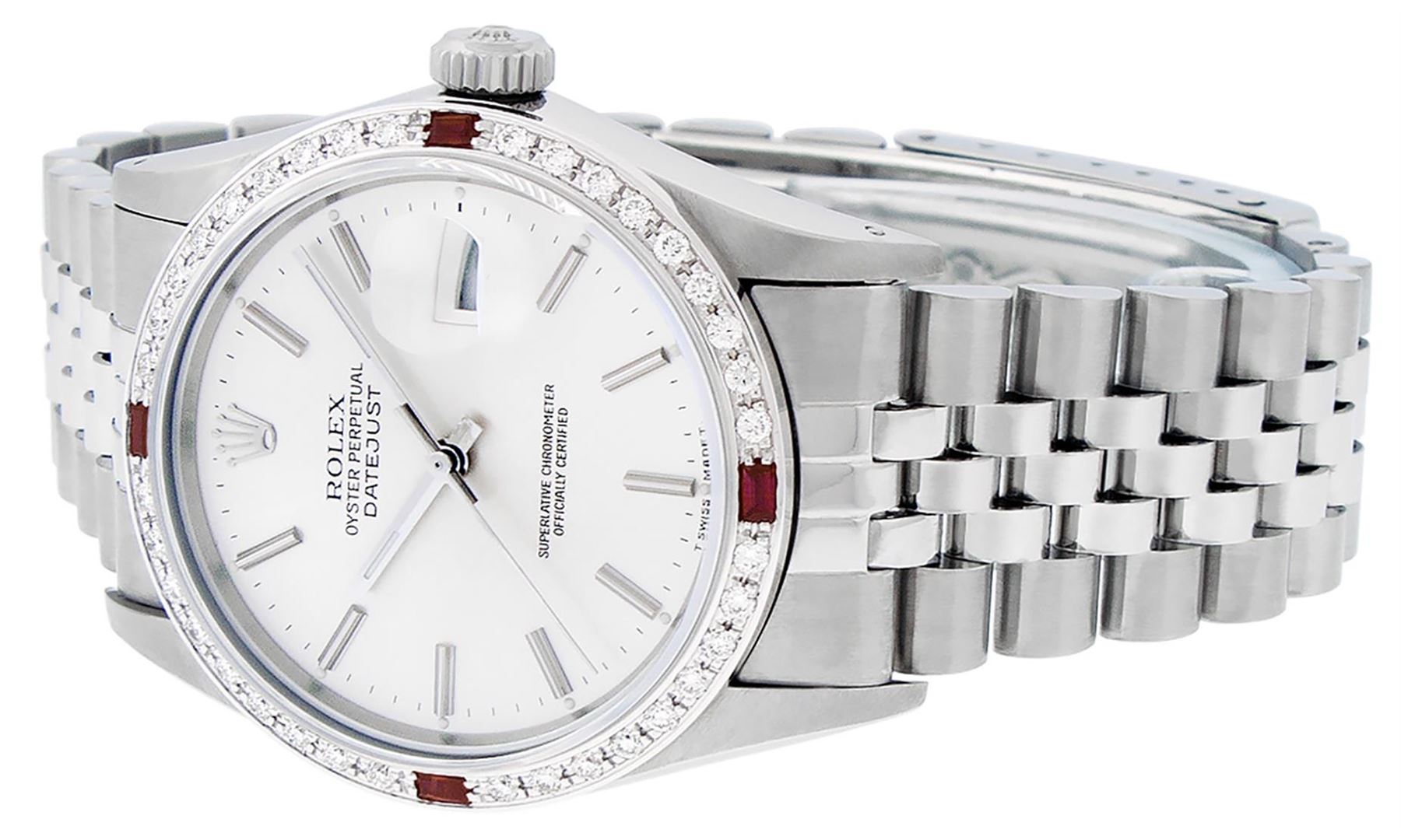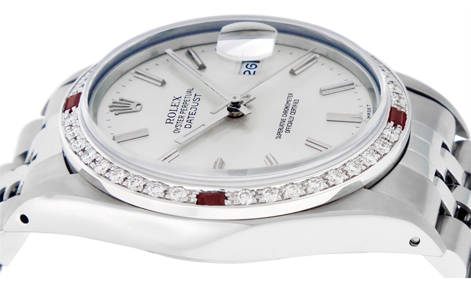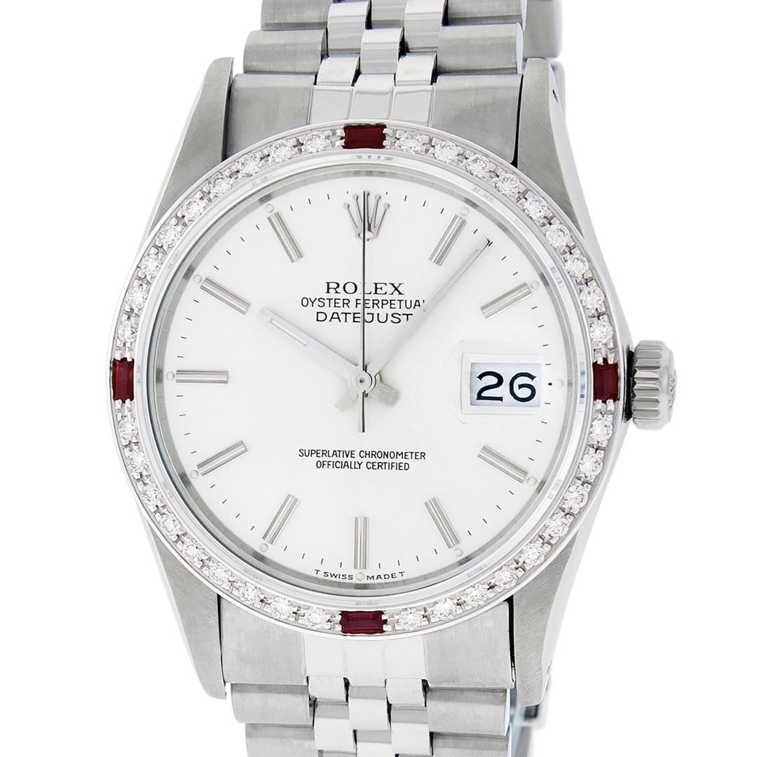 One Mens Stainless Steel Rolex Datejust Polished Bright with Satin Finish, This Watch Has Been Serviced & Electronically Tested, Stainless Steel Case: 36mm, Stainless Steel Crown, Custom Bezel: New 18K White Gold Ruby Beadset Diamond Bezel, Diamond + Gem Count: 36 Diamonds + 4 Rubies, Total Weight 1.00 Carat, Clarity: SI-VS, Color: G to H. Custom Crystal: New Synthetic Sapphire Cyclops Lens. Custom Hands: New Luminescent Hands. Movement: Automatic Winding Movement. Dial: Silver Index With Dash Track & Lumi Dots. Date Window: 3 O'Clock Position Date Display, Quickset, Model: Datejust, Condition: G-6 Extra Fine. Bracelet: Stainless Steel Jubilee. Bracelet: 7.0 Inch Length, Adjustable. Standard Clasp, With Rolex Logo. This Watch Has Been Serviced Time Tested And Is In Excellent Condition It Is Free Of All Scratches And Dents.