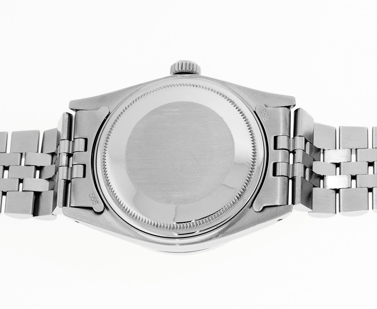 One Mens Pre Owned Stainless Steel Rolex Datejust Polished Bright with Satin Finish, This Watch Has Been Serviced & Electronically Tested, Rolex Stainless Steel Case: 36mm, Rolex Stainless Steel Crown, Custom Bezel: New 18K White Gold Emerald Beadset Diamond Bezel, Diamond + Gem Count: 36 Diamonds + 4 Emeralds, Total Weight 1.00 Carat, Clarity: SI-VS, Color: G to H. Custom Crystal: New Sapphire With Magnified Date Window. Custom Hands: New Luminescent Hands. Rolex Movement: Automatic Winding Movement 3035. Rolex Dial: Silver Index With Dash Track & Lumi Dots. Date Window: 3 O'Clock Position Date Display, Quickset, Model: Datejust, Condition: G-6 Extra Fine. Rolex Bracelet: Stainless Steel Jubilee Band. Bracelet: 7.0 Inch Length, Adjustable. Standard Clasp, With Rolex Logo. This Watch Has Been Serviced Time Tested And Is In Excellent Condition It Is Free Of All Scratches And Dents.