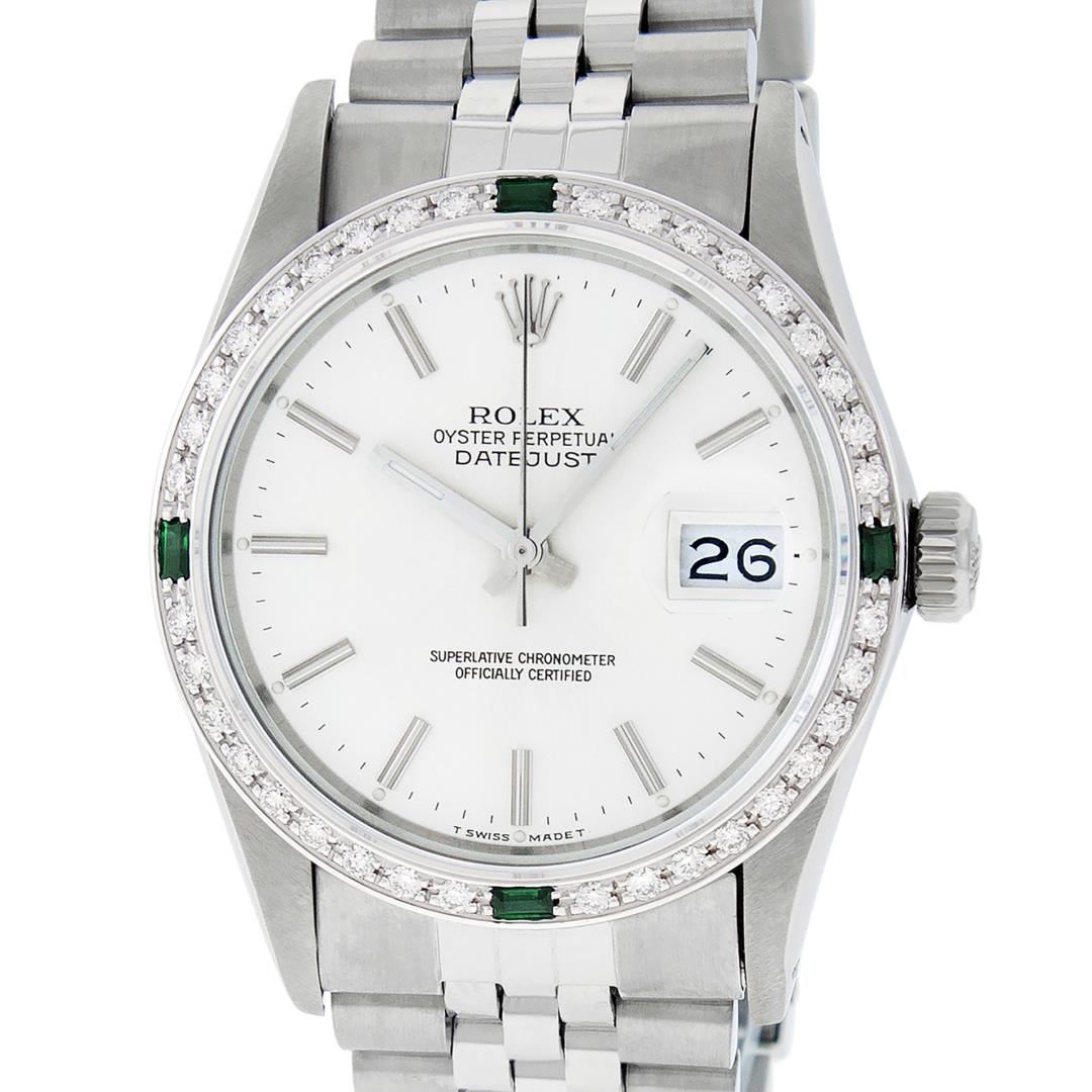 One Mens Pre Owned Stainless Steel Rolex Datejust Polished Bright with Satin Finish, This Watch Has Been Serviced & Electronically Tested, Rolex Stainless Steel Case: 36mm, Rolex Stainless Steel Crown, Custom Bezel: New 18K White Gold Emerald Beadset Diamond Bezel, Diamond + Gem Count: 36 Diamonds + 4 Emeralds, Total Weight 1.00 Carat, Clarity: SI-VS, Color: G to H. Custom Crystal: New Sapphire With Date Window. Custom Hands: New Luminescent Hands. Rolex Movement: Automatic Winding Movement 3035. Rolex Dial: Silver Index With Dash Track & Lumi Dots. Date Window: 3 O'Clock Position Date Display, Quickset, Model: Datejust, Condition: G-6 Extra Fine. Rolex Bracelet: Stainless Steel Jubilee Band. Bracelet: 7.0 Inch Length, Adjustable. Standard Clasp, With Rolex Logo. This Watch Has Been Serviced Time Tested And Is In Excellent Condition It Is Free Of All Scratches And Dents.