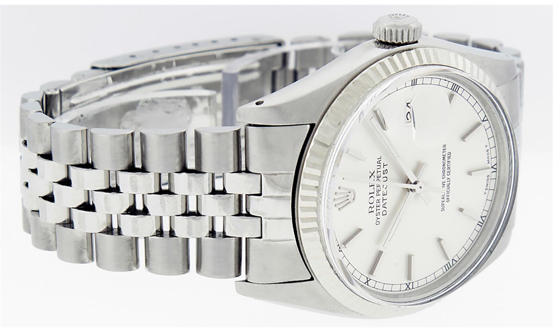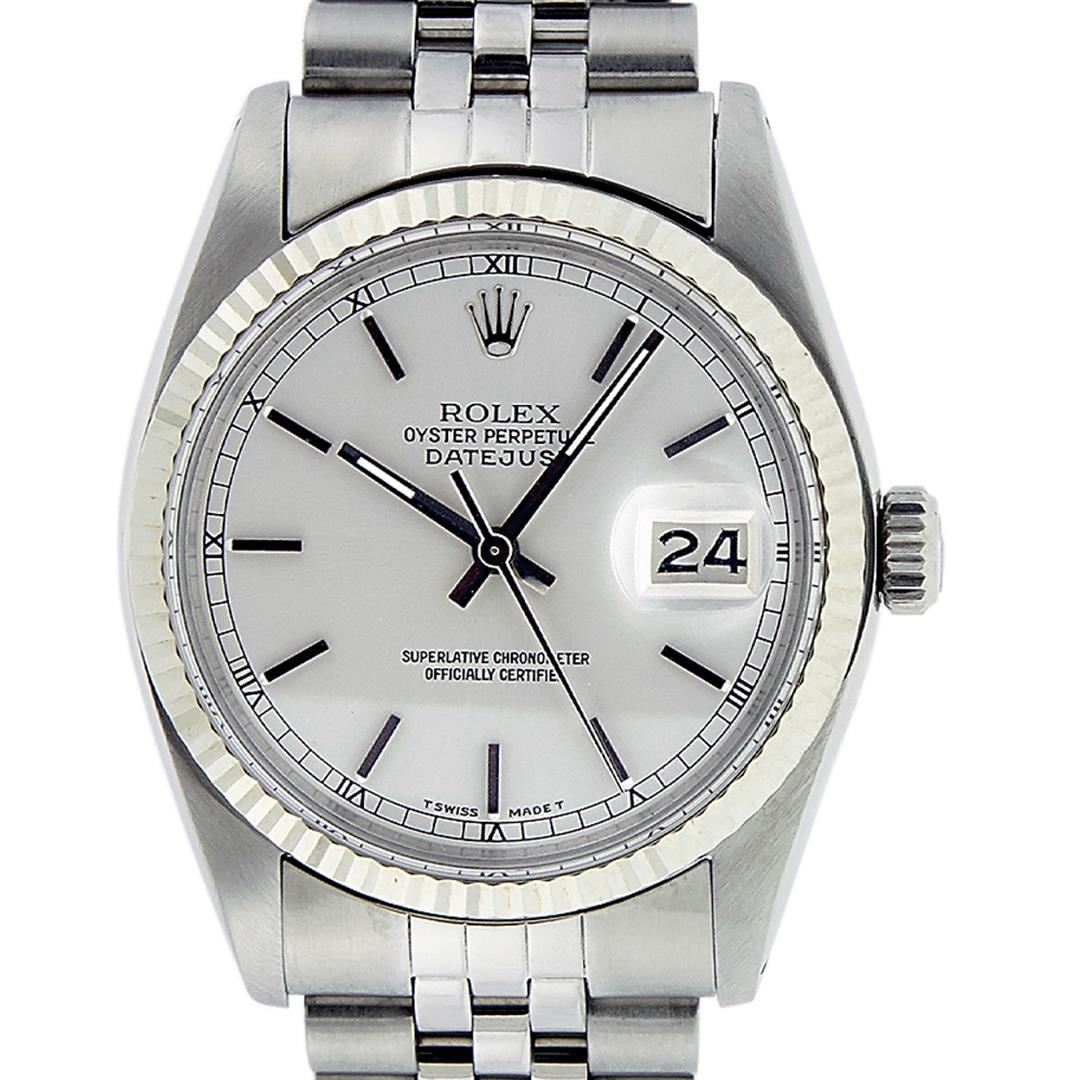 One Mens Pre Owned Rolex Stainless Steel Rolex Datejust Polished, Serviced & Electronically Tested, Rolex Stainless Steel Case: 36mm, Stainless Steel Crown, Rolex Bezel: 14K White Gold Fluted Bezel. Custom Crystal: Acrylic Cyclops Lens. Custom Hands: New
