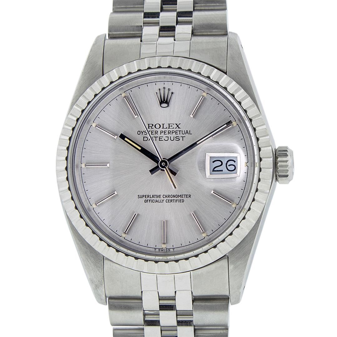 One Mens Pre Owned Stainless Steel Rolex Datejust Polished, Serviced & Electronically Tested, Rolex Stainless Steel Case: 36mm, Stainless Steel Crown, Rolex Bezel: 14K White Gold Fluted Bezel. Custom Crystal: Acrylic Cyclops Lens. Rolex Hands: Luminescent Hands. Rolex Movement: Automatic Winding Movement. Rolex Dial: Silver Index With Dash Track. Date Window: 3 O'Clock Position Date Display, Quickset, Model: Datejust, Condition: G-6 Extra Fine. Rolex Bracelet: Stainless Steel Jubilee Band. Bright Polish & Satin Finish. 7.0 Inch Length, Adjustable. Standard Clasp, With Rolex Logo. This Watch Has Been Serviced Time Tested And Is In Excellent Condition It Is Free Of All Scratches And Dents.