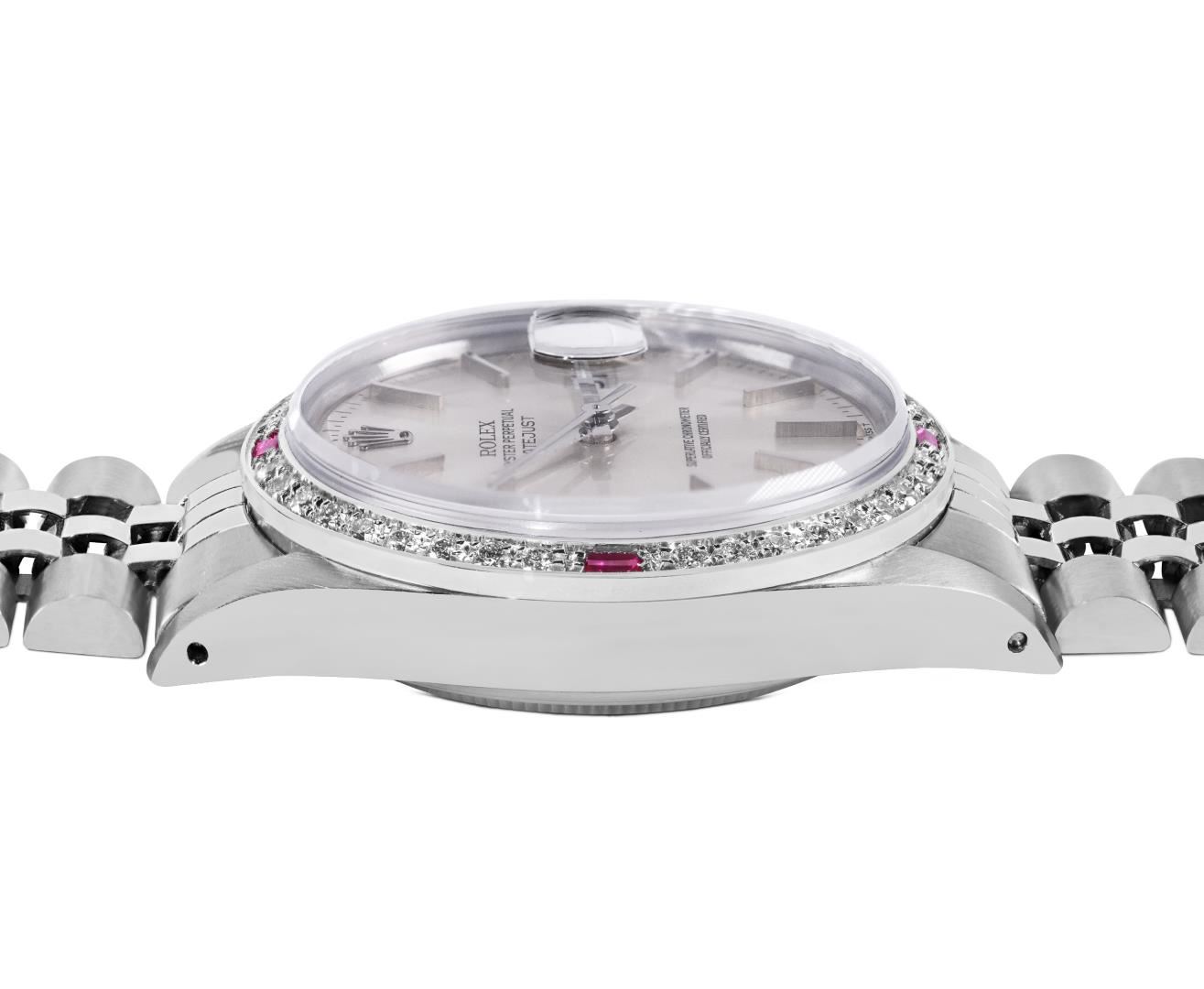 One Mens Pre Owned Rolex Datejust Polished Bright with Satin Finish, This Watch Has Been Serviced & Electronically Tested, Rolex Stainless Steel Case: 36mm, Rolex Stainless Steel Crown, Custom Bezel: New 18K White Gold Ruby Beadset Diamond Bezel, Diamond + Gem Count: 36 Diamonds + 4 Rubies. Custom Crystal: New Sapphire With Date Window. Custom Hands: New Luminescent Hands. Rolex Movement: Automatic Winding Movement 3035. Rolex Dial: Silver Index Dial. Date Window: 3 O'clock Position Date Display, Quickset, Model: Quickset Datejust, Condition: G-6 Extra Fine. Rolex Bracelet: Stainless Steel Jubilee Band. Bracelet: 7.0 Inch Length, Adjustable. Standard Clasp, With Rolex Logo. This Watch Has Been Serviced Time Tested And Is In Excellent Condition It Is Free Of All Scratches And Dents. This Watch Comes With A Rolex Box.