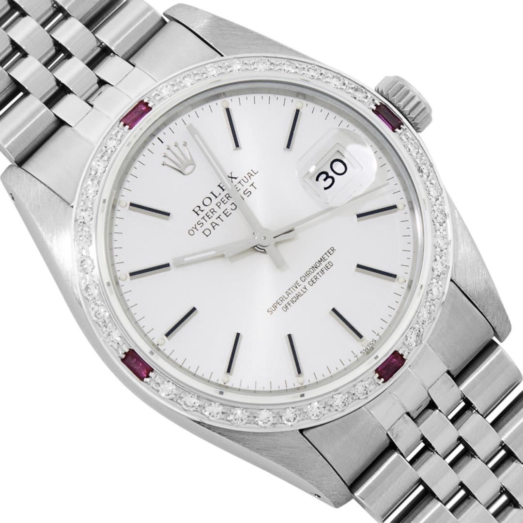 One Mens Pre Owned Stainless Steel Rolex Datejust Polished Bright with Satin Finish, This Watch Has Been Serviced & Electronically Tested, Rolex Stainless Steel Case: 36mm, Rolex Stainless Steel Crown, Custom Bezel: New 18K White Gold Ruby Beadset Diamond Bezel, Diamond + Gem Count: 36 Diamonds + 4 Rubies, Total Weight 1.00 Carat, Clarity: SI-VS, Color: G to H. Custom Crystal: New Sapphire With Magnified Date Window. Custom Hands: New Luminescent Hands. Rolex Movement: Automatic Winding Movement 3035. Rolex Dial: Silver Index With Dash Track & Lumi Dots. Date Window: 3 O'Clock Position Date Display, Quickset, Model: Datejust, Condition: G-6 Extra Fine. Rolex Bracelet: Stainless Steel Jubilee Band. Bracelet: 7.0 Inch Length, Adjustable. Standard Clasp, With Rolex Logo. This Watch Has Been Serviced Time Tested And Is In Excellent Condition It Is Free Of All Scratches And Dents.