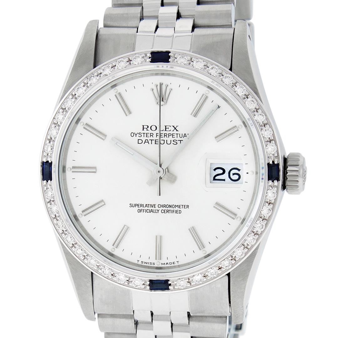 One Mens Pre Owned Stainless Steel Rolex Datejust Polished Bright with Satin Finish, This Watch Has Been Serviced & Electronically Tested, Stainless Steel Case: 36mm, Rolex Stainless Steel Crown, Custom Bezel: New 18K White Gold Sapphire Beadset Diamond Bezel, Diamond + Gem Count: 36 Diamonds + 4 Sapphires, Clarity: SI-VS, Color: G to H. Custom Crystal: New Sapphire With Date Window. Custom Hands: New Luminescent Hands. Rolex Movement: Automatic Winding Movement 3035. Rolex Dial: Silver Index With Dash Track & Lumi Dots. Date Window: 3 O'Clock Position Date Display, Quickset, Model: Datejust, Condition: G-6 Extra Fine. Rolex Bracelet: Stainless Steel Jubilee Band. Bracelet: 7.0 Inch Length, Adjustable. Standard Clasp, With Rolex Logo. This Watch Has Been Serviced Time Tested And Is In Excellent Condition It Is Free Of All Scratches And Dents.