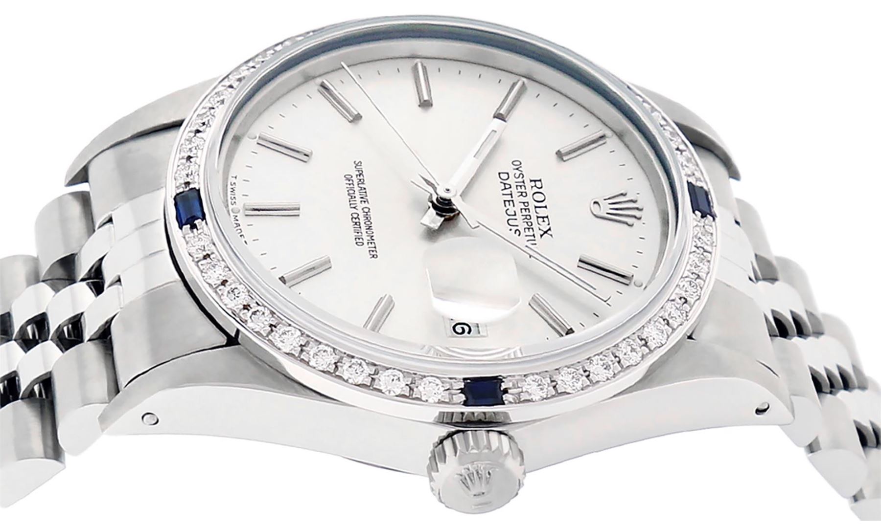 One Mens Pre Owned Stainless Steel Rolex Datejust Polished Bright with Satin Finish, This Watch Has Been Serviced & Electronically Tested, Stainless Steel Case: 36mm, Rolex Stainless Steel Crown, Custom Bezel: New 18K White Gold Sapphire Beadset Diamond Bezel, Diamond + Gem Count: 36 Diamonds + 4 Sapphires, Clarity: SI-VS, Color: G to H. Custom Crystal: New Sapphire With Date Window. Custom Hands: New Luminescent Hands. Rolex Movement: Automatic Winding Movement 3035. Rolex Dial: Silver Index With Dash Track & Lumi Dots. Date Window: 3 O'Clock Position Date Display, Quickset, Model: Datejust, Condition: G-6 Extra Fine. Rolex Bracelet: Stainless Steel Jubilee Band. Bracelet: 7.0 Inch Length, Adjustable. Standard Clasp, With Rolex Logo. This Watch Has Been Serviced Time Tested And Is In Excellent Condition It Is Free Of All Scratches And Dents.
