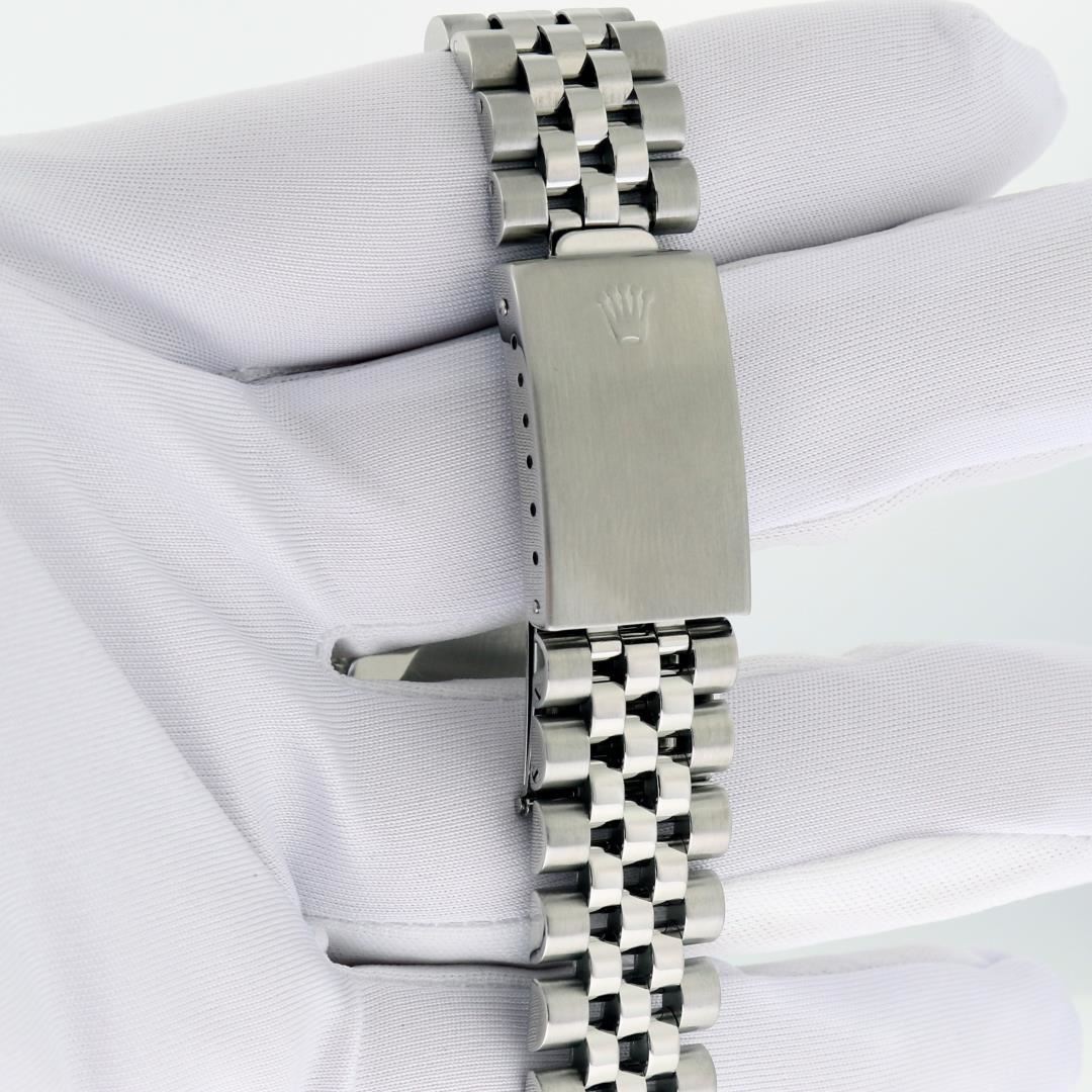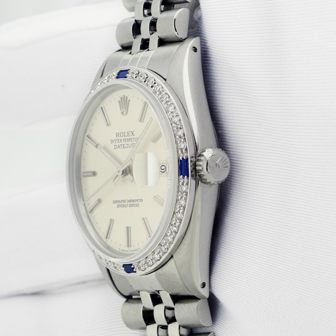 One Mens Pre Owned Rolex Datejust Polished Bright with Satin Finish, This Watch Has Been Serviced & Electronically Tested, Rolex Stainless Steel Case: 36mm, Rolex Stainless Steel Crown, Custom Bezel: New 18K White Gold Sapphire Bead-set Diamond Bezel, Diamond + Gem Count: 36 Diamonds + 4 Sapphires, Clarity: SI-VS, Color: G to H. Custom Crystal: New Sapphire With Date Window. Custom Hands: New Luminescent Hands. Rolex Movement: Automatic Winding Movement. Rolex Dial: Silver Index Dial With Dash Track. Date Window: 3 O'Clock Position Date Display, Quickset, Model: Datejust, Condition: G-6 Extra Fine. Rolex Bracelet: Stainless Steel Jubilee Band. Bracelet: 7.0 Inch Length, Adjustable. Standard Clasp, With Rolex Logo. This Watch Has Been Serviced Time Tested And Is In Excellent Condition It Is Free Of All Scratches And Dents.