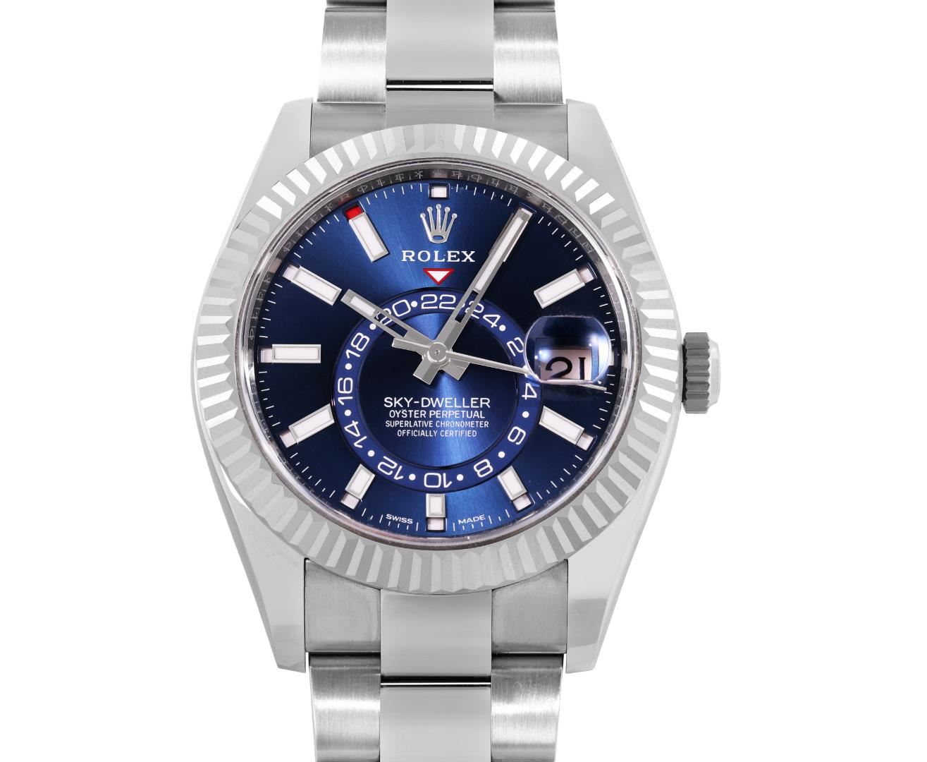 One Mens Pre Owned Stainless Steel Rolex Sky Dweller With Date Polished, Serviced And Electronically Tested, Rolex Stainless Steel Case: 42mm, Rolex Stainless Steel Crown, Rolex Bezel: 18K White Gold Rotatable Fluted Bezel. Rolex Crystal: Sapphire With Magnified Date Window. Rolex Movement: Automatic Winding Movement Caliber 9001. Rolex Dial: Rolex Blue Sky Dweller Dial with Luminous Index Hour Markers. Date Window: 3 O'Clock Position Date Display, Model: Sky Dweller, Functions: Quickset, Month Calendar Feature, Dual Time. Condition: G-6 Extra Fine. Rolex Bracelet: Stainless Steel Oyster Band. Bright Polish And Satin Finish. 7.25 Inch Length, Adjustable. Standard Clasp, With Rolex Logo. This Watch Has Been Serviced Time Tested And Is In Excellent Condition It Is Free Of All Scratches And Dents. This Watch Comes With Rolex Box And Papers.