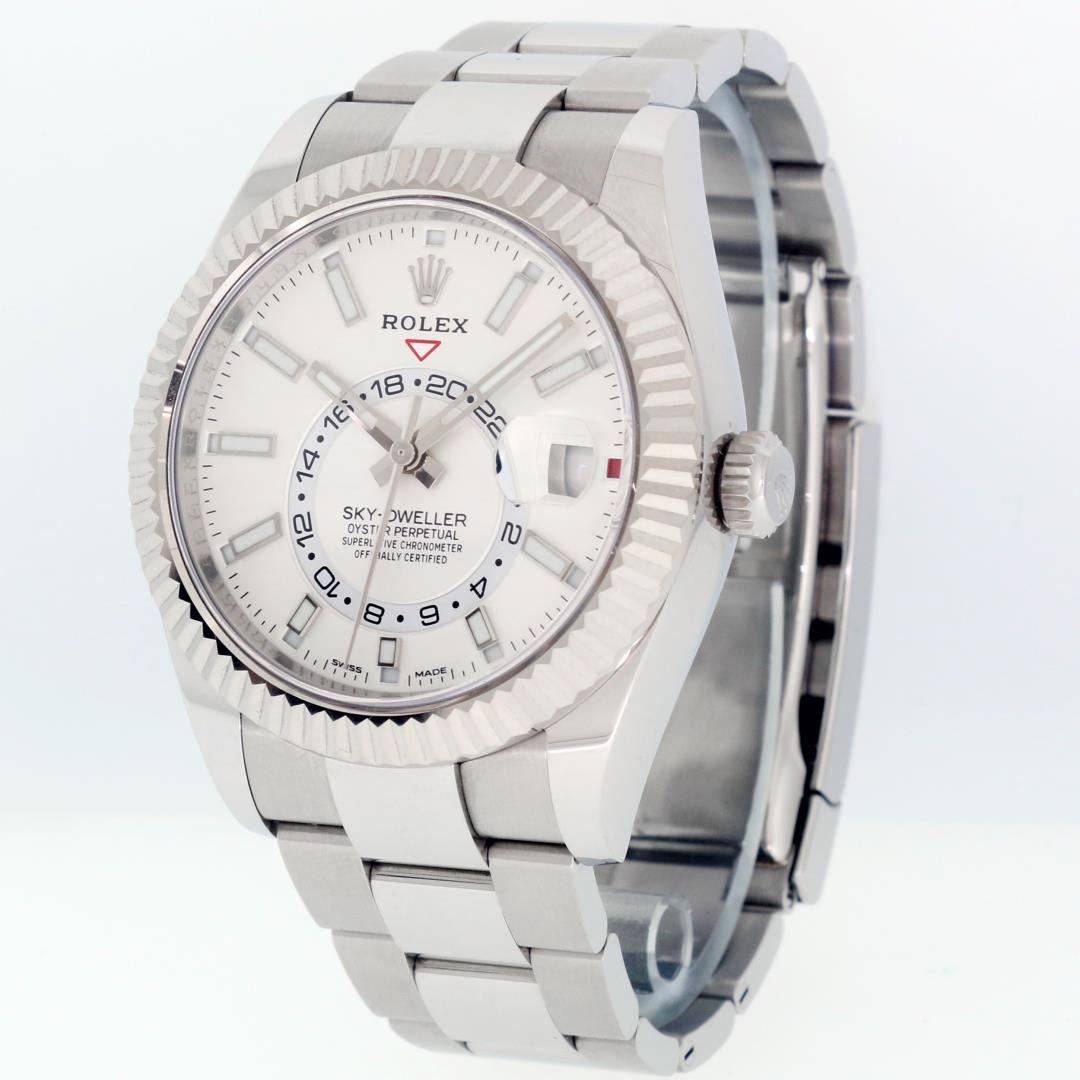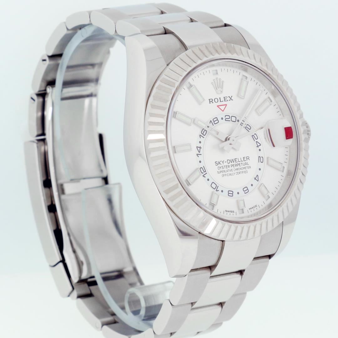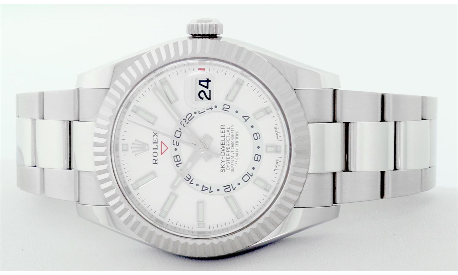 One Mens Pre Owned Stainless Steel Rolex Sky Dweller With Date Polished, Serviced & Electronically Tested, Rolex Stainless Steel Case: 42mm, Rolex Stainless Steel Crown, Rolex Bezel: 18K White Gold Rotatable Fluted Bezel. Rolex Crystal: Sapphire With Magnified Date Window. Rolex Movement: Automatic Winding Movement Caliber 9001. Rolex Dial: Rolex White Sky Dweller Dial with Luminous Index Hour Markers. Date Window: 3 O'Clock Position Date Display, Model: Sky Dweller, Quickset, Month Calendar Feature, Dual Time. Condition: G-6 Extra Fine. Rolex Bracelet: Stainless Steel Oyster Band. Bright Polish & Satin Finish. 7.25 Inch Length, Adjustable. Standard Clasp, With Rolex Logo. This Watch Has Been Serviced Time Tested And Is In Excellent Condition It Is Free Of All Scratches And Dents. This Watch Comes With A Rolex Box, Rolex Papers, And Rolex Booklet.