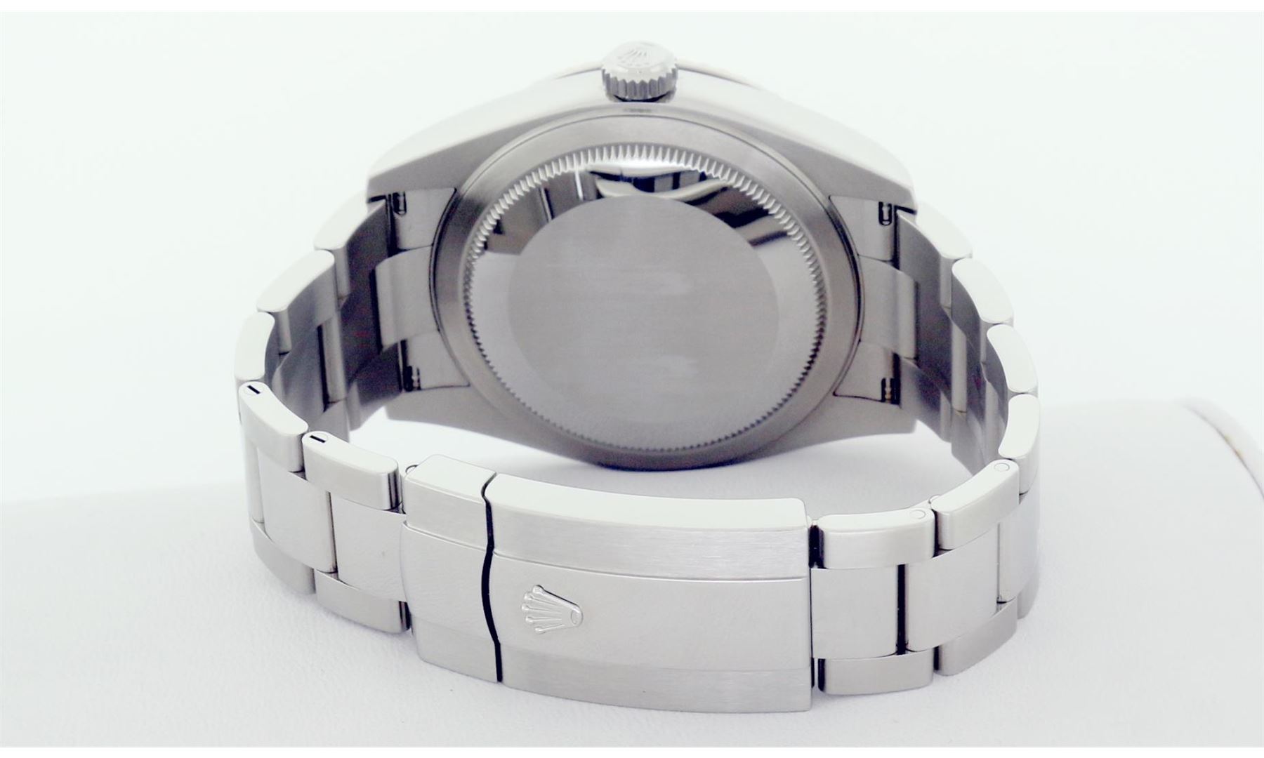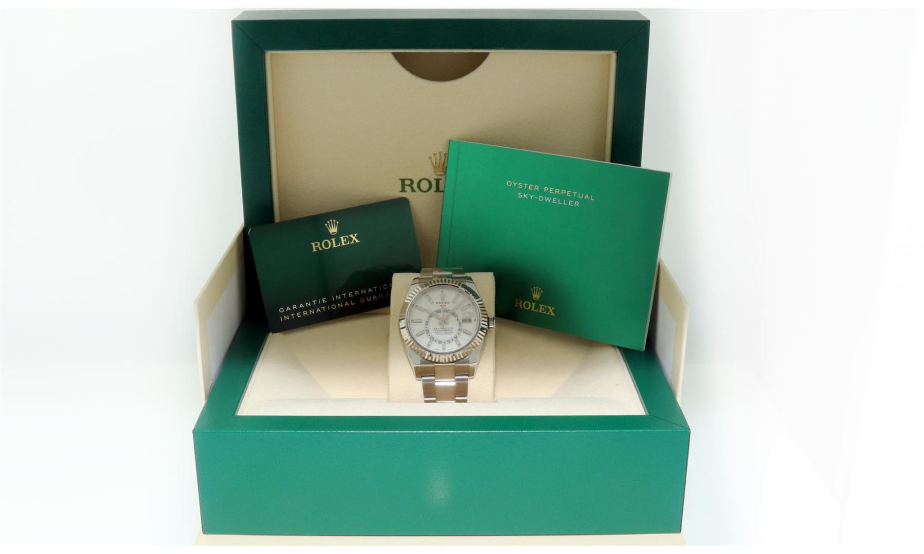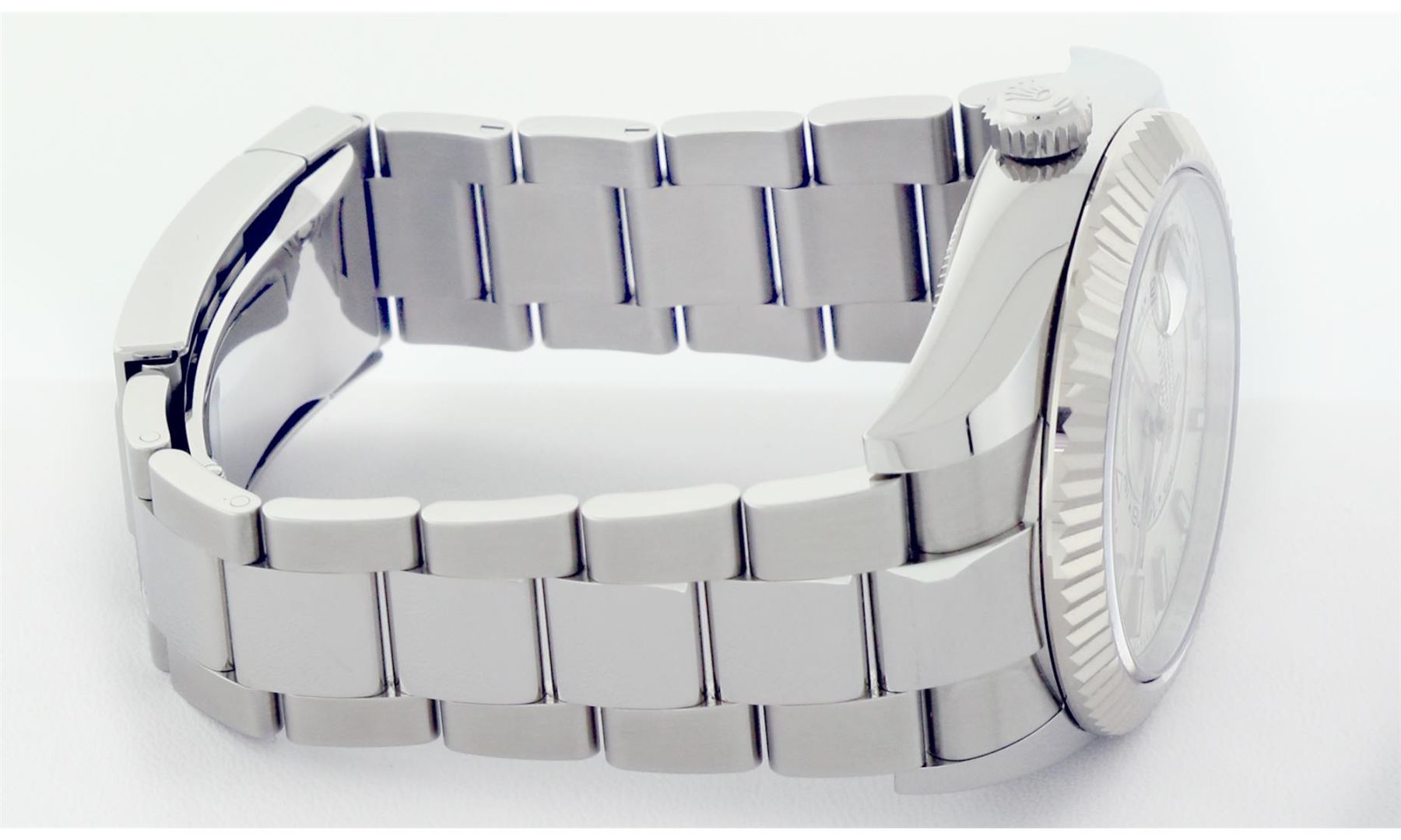 One Mens Pre Owned Stainless Steel Rolex Sky Dweller With Date Polished, Serviced & Electronically Tested, Rolex Stainless Steel Case: 42mm, Rolex Stainless Steel Crown, Rolex Bezel: 18K White Gold Rotatable Fluted Bezel. Rolex Crystal: Sapphire With Magnified Date Window. Rolex Movement: Automatic Winding Movement Caliber 9001. Rolex Dial: Rolex White Sky Dweller Dial with Luminous Index Hour Markers. Date Window: 3 O'Clock Position Date Display, Model: Sky Dweller, Quickset, Month Calendar Feature, Dual Time. Condition: G-6 Extra Fine. Rolex Bracelet: Stainless Steel Oyster Band. Bright Polish & Satin Finish. 7.25 Inch Length, Adjustable. Standard Clasp, With Rolex Logo. This Watch Has Been Serviced Time Tested And Is In Excellent Condition It Is Free Of All Scratches And Dents. This Watch Comes With A Rolex Box, Rolex Papers, And Rolex Booklet.