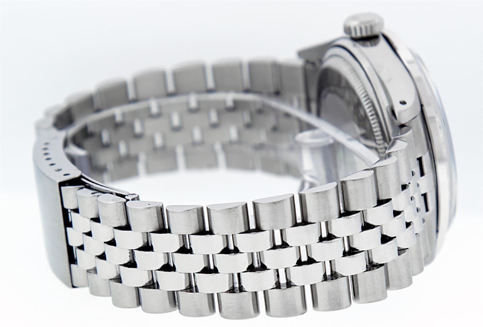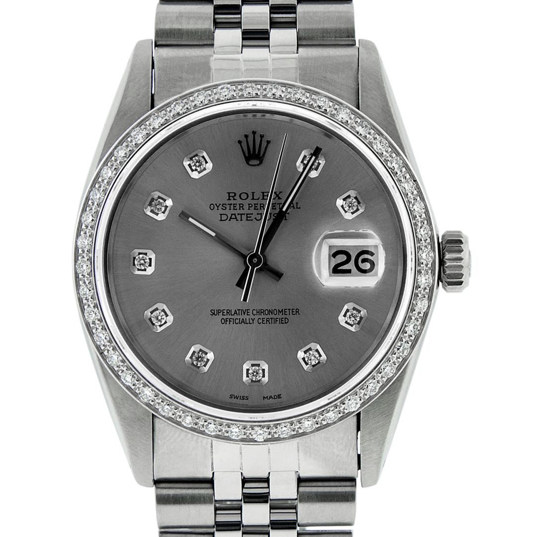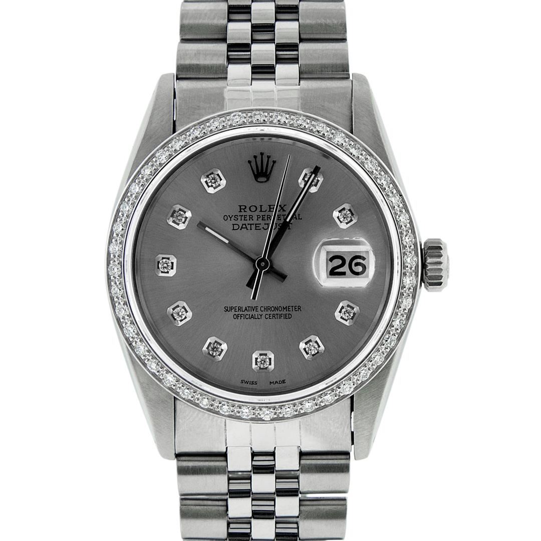 One Mens Stainless Steel Rolex Datejust Polished, Serviced & Electronically Tested, Stainless Steel Case: 36mm, Stainless Steel Crown, Custom Bezel: New 18K White Gold Beadset Diamond Bezel, Diamond Count: 44 Diamonds In Bezel, Total Weight 1.00 Carat, Clarity: SI-VS, Color: G to H. Custom Crystal: New Scratch Resistant Synthetic Sapphire Cyclops Lens. Custom Hands: New Luminescent Hands. Movement: Automatic Winding Movement Caliber 3035. Custom Dial: Slate Grey Diamond Dial, Diamond Count: 10 Diamonds in Dial, G To H In Color, Clarity: SI-VS. Date Window: 3 O'Clock Position Date Display, Quickset, Model: Datejust. Condition: G-6 Extra Fine. Bracelet: Stainless Steel Jubilee Band. Bright Polish & Satin Finish. 7.0 Inch Length, Adjustable. Standard Clasp, With Rolex Logo. This Watch Has Been Serviced Time Tested And Is In Excellent Condition It Is Free Of All Scratches And Dents.