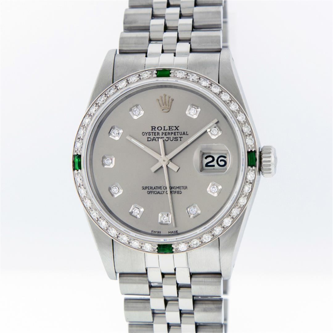 One Mens Rolex Datejust Polished, Serviced & Electronically Tested, Stainless Steel Case:36mm, Stainless Steel Crown, Custom Bezel: 18K White Gold Emerald Beadset Diamond Bezel, Diamond + Gem Count: 36 Diamonds + 4 Emeralds Total Weight 1.00 Carat, Clarity: SI-VS, Color: G to H. Custom Crystal: Synthetic Sapphire Cyclops Lens. Movement: Automatic Winding Movement Caliber 3035. Custom Dial: Slate Grey With Diamond Hour Markers, 10 Diamond Dial G To H In Color, Clarity: SI-VS. Date Window: 3 O'Clock Position Date Display, Quickset, Model: Datejust, Condition: G-6 Extra Fine. Bracelet: Stainless Steel Jubilee. Bright Polish & Satin Finish. 7.0 Inch Length, Adjustable. Standard Clasp, With Rolex Logo.