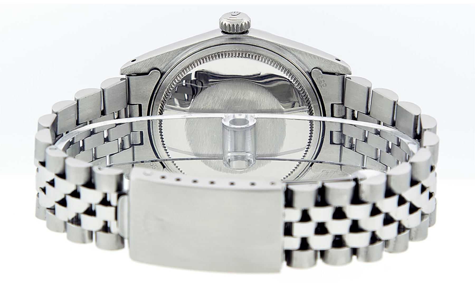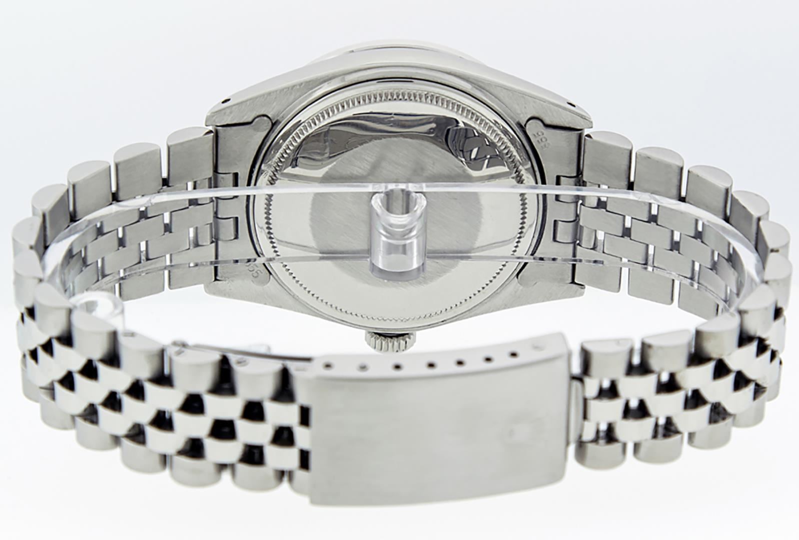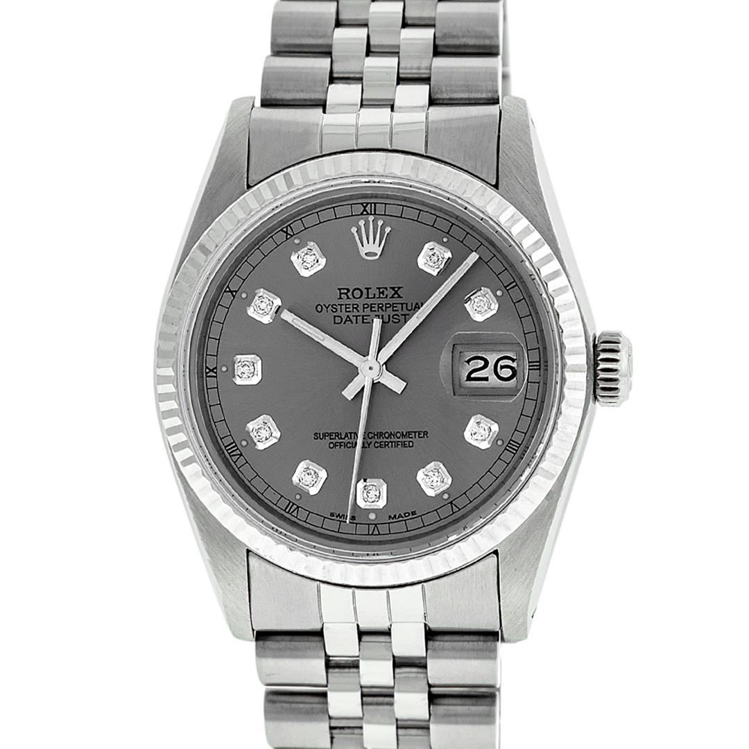 One Pre Owned Stainless Steel Rolex 36MM Datejust Polished Bright with Satin Finish, This Watch Has Been Serviced & Electronically Tested, Stainless Steel Case: 36mm, Stainless Steel Crown, Rolex Bezel: White Gold Fluted Bezel. Custom Crystal: New Plexiglass With Magnified Date Window. Custom Hands: New Luminescent Hands. Rolex Movement: Automatic Winding Movement 3035. Custom Dial: Custom Slate Grey Dial With Added Diamond Hour Markers, Diamond Count: 10 Diamonds in Dial. Date Window: 3 O'Clock Position Date Display, Quickset, Model: Datejust, Condition: G-6 Extra Fine. Rolex Bracelet: Stainless Steel Jubilee Band. Bright Polish & Satin Finish. 7.0 Inch Length, Adjustable. Fold Clasp, With Rolex Logo. This Watch Has Been Serviced Time Tested And Is In Excellent Condition It Is Free Of All Scratches And Dents.