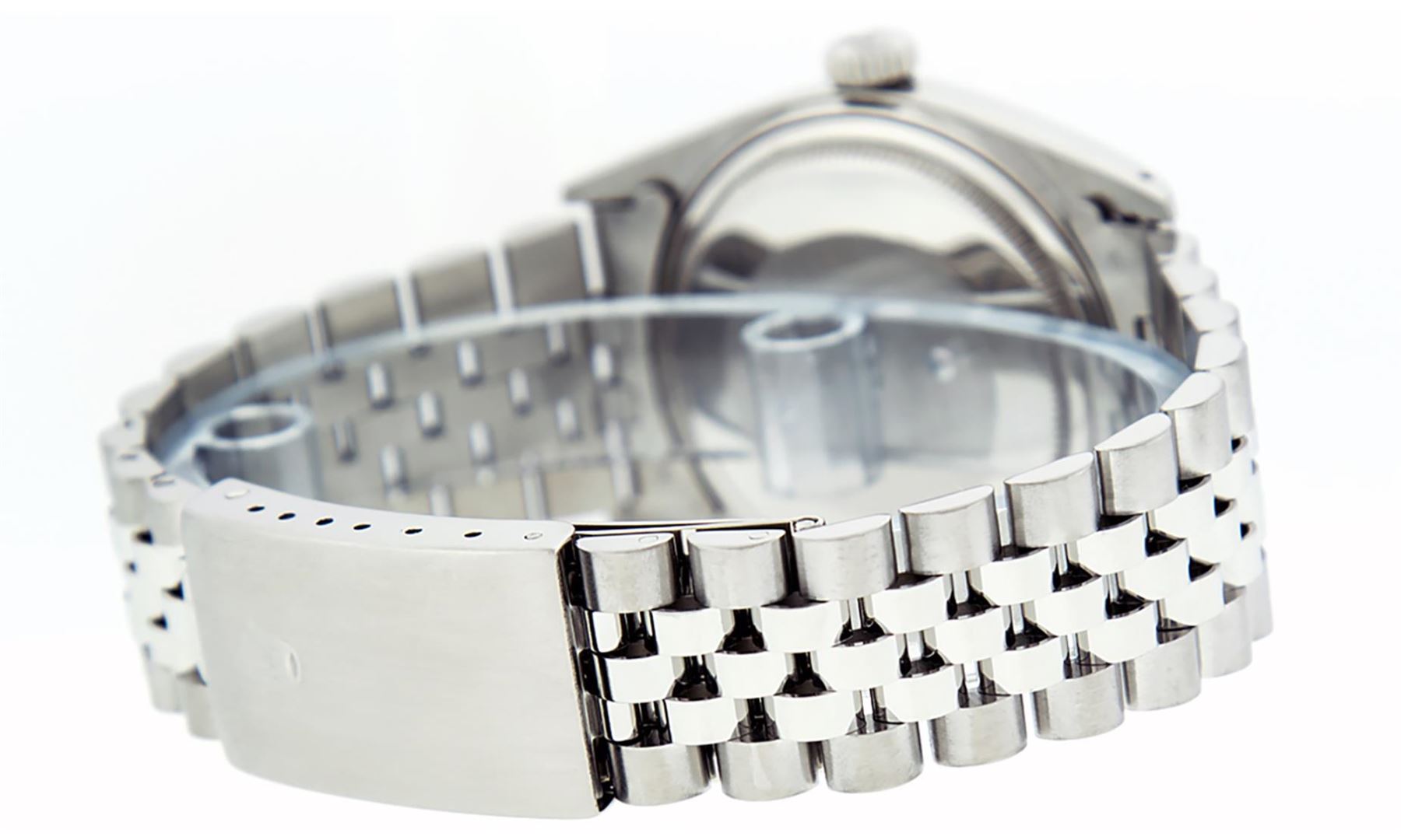 One Mens Pre Owned Stainless Steel Rolex Datejust Polished Bright with Satin Finish, Serviced & Electronically Tested, Stainless Steel Case: 36mm, Stainless Steel Crown, Bezel: White Gold Fluted Bezel. Custom Crystal: New Acrylic With Magnified Date Window. Custom Hands: New Luminescent Hands. Rolex Movement: Automatic Winding Movement 3035. Custom Dial: Custom Slate Grey With Added Diamonds, Diamond Count: 10 Diamond in Dial. Date Window: 3 O'clock Position Date Display, Quickset, Model: Quickset Datejust, Condition: G-6 Extra Fine. Rolex Bracelet: Stainless Steel Jubilee Band. Bright Polish & Satin Finish. 7.0 Inch Length, Adjustable. Standard Clasp, With Rolex Logo. This Watch Has Been Serviced And Polished It Is Free Of All Scratches And Dents.