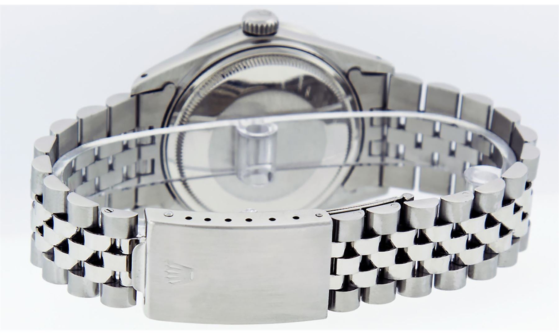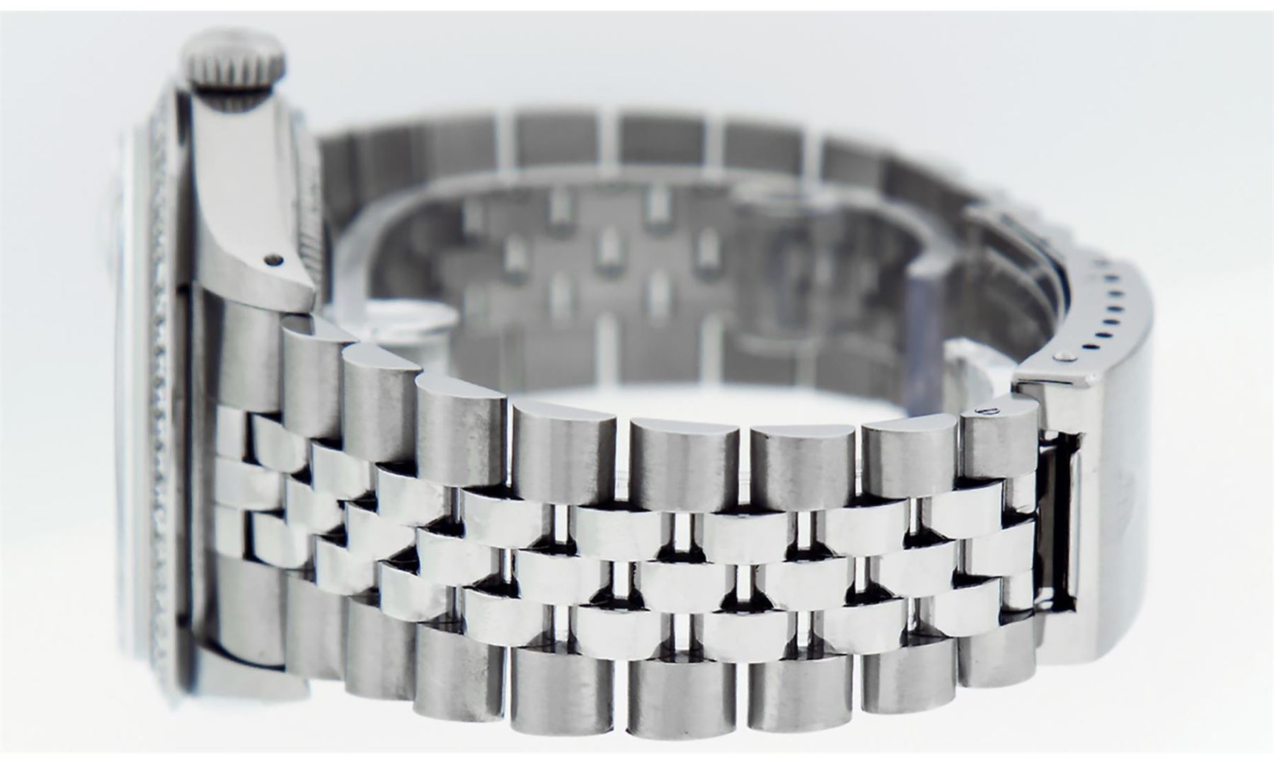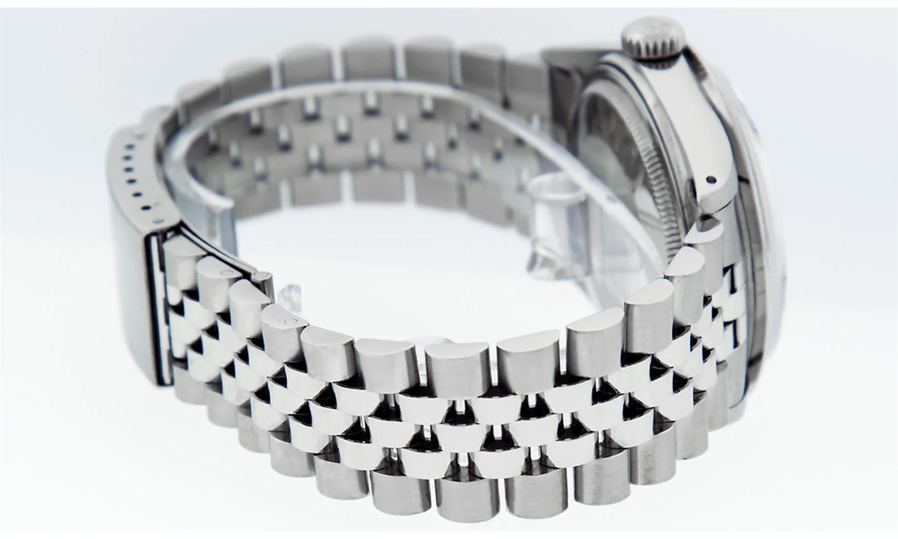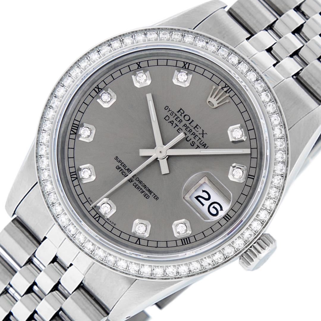 One Pre Owned Rolex Stainless Steel Datejust Polished Bright with Satin Finish, This Watch Has Been Serviced & Electronically Tested, Stainless Steel Case: 36mm, Stainless Steel Crown, Custom Bezel: New Stainless Steel Beadset Diamond Bezel, Diamond Count: 54 Diamonds. Custom Crystal: New Sapphire With Magnified Date Window. Custom Hands: New Luminescent Hands. Movement: Automatic Winding Movement 3035. Custom Dial: Custom Slate Grey Dial With Added Diamond Hour Markers, Diamond Count: 10 Diamonds In Dial. Date Window: 3 O'Clock Position Date Display, Quickset, Model: Datejust. Condition: G-6 Extra Fine. Rolex Bracelet: Stainless Steel Jubilee Band. Bright Polish & Satin Finish. 7.0 Inch Length, Adjustable. Fold Clasp, With Rolex Logo. This Watch Has Been Serviced Time Tested And Is In Excellent Condition It Is Free Of All Scratches And Dents.