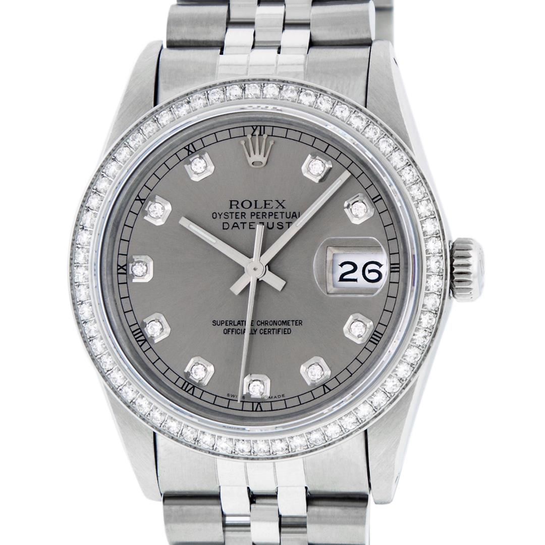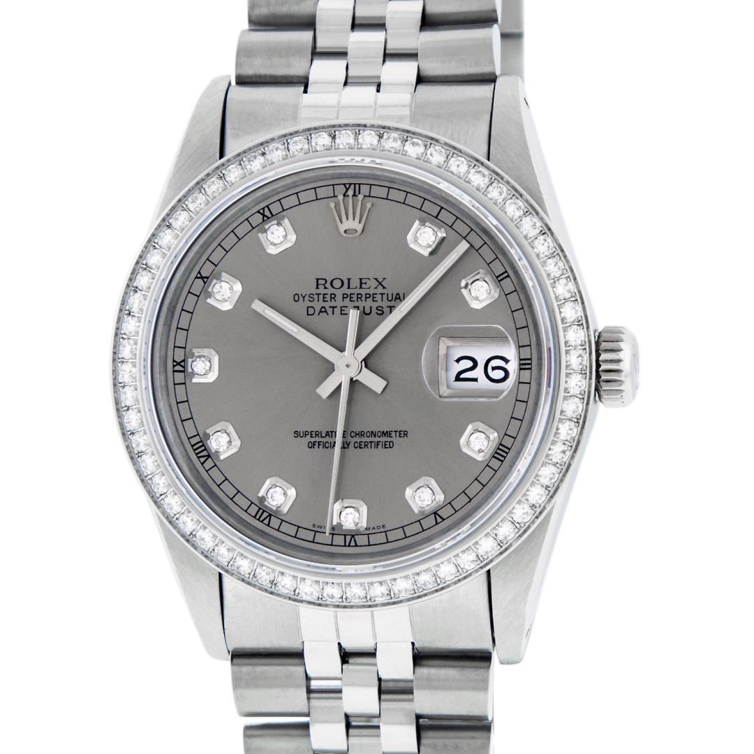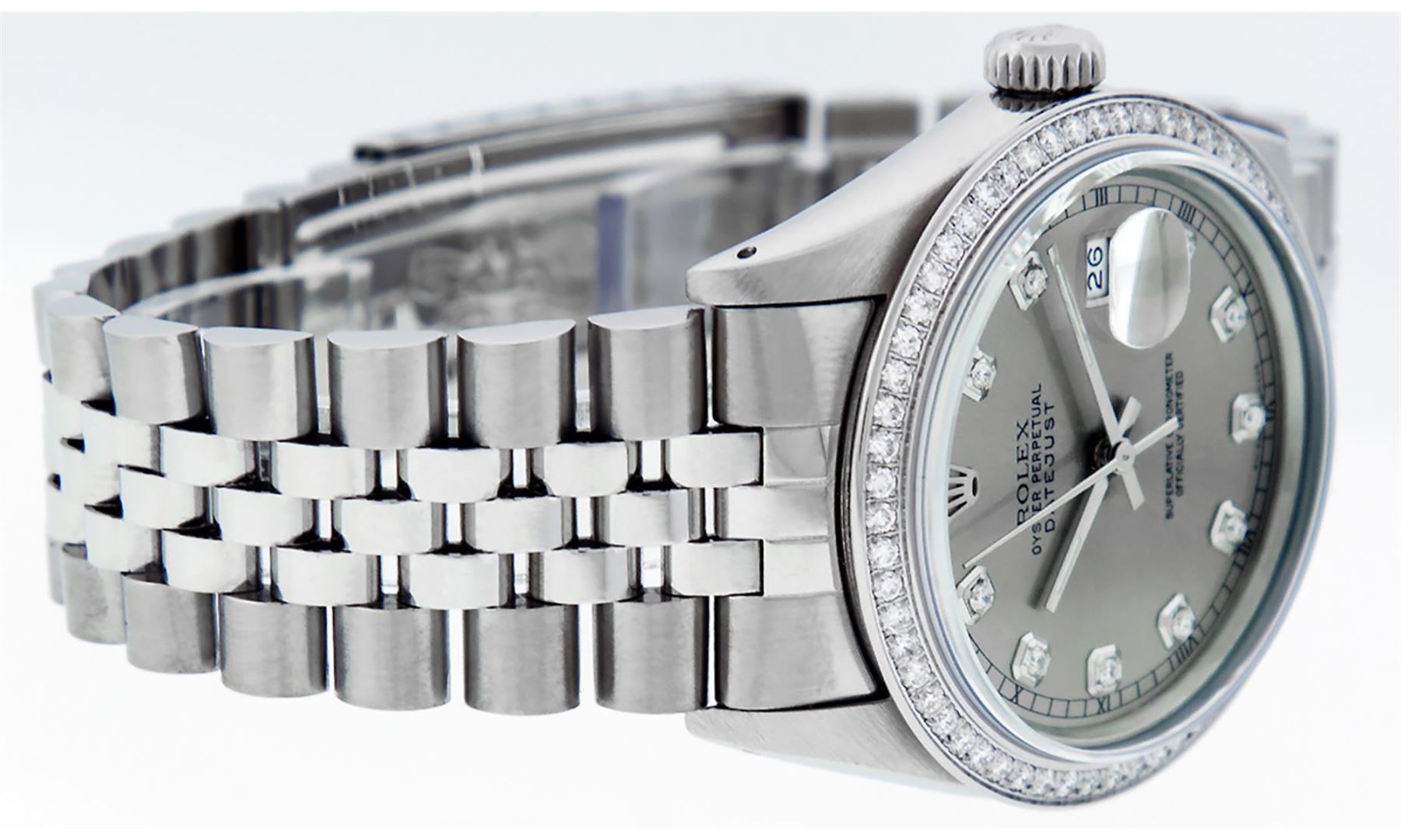 One Pre Owned Rolex Stainless Steel Datejust Polished Bright with Satin Finish, This Watch Has Been Serviced & Electronically Tested, Stainless Steel Case: 36mm, Stainless Steel Crown, Custom Bezel: New Stainless Steel Beadset Diamond Bezel, Diamond Count: 54 Diamonds. Custom Crystal: New Sapphire With Magnified Date Window. Custom Hands: New Luminescent Hands. Movement: Automatic Winding Movement 3035. Custom Dial: Custom Slate Grey Dial With Added Diamond Hour Markers, Diamond Count: 10 Diamonds In Dial. Date Window: 3 O'Clock Position Date Display, Quickset, Model: Datejust. Condition: G-6 Extra Fine. Rolex Bracelet: Stainless Steel Jubilee Band. Bright Polish & Satin Finish. 7.0 Inch Length, Adjustable. Fold Clasp, With Rolex Logo. This Watch Has Been Serviced Time Tested And Is In Excellent Condition It Is Free Of All Scratches And Dents.